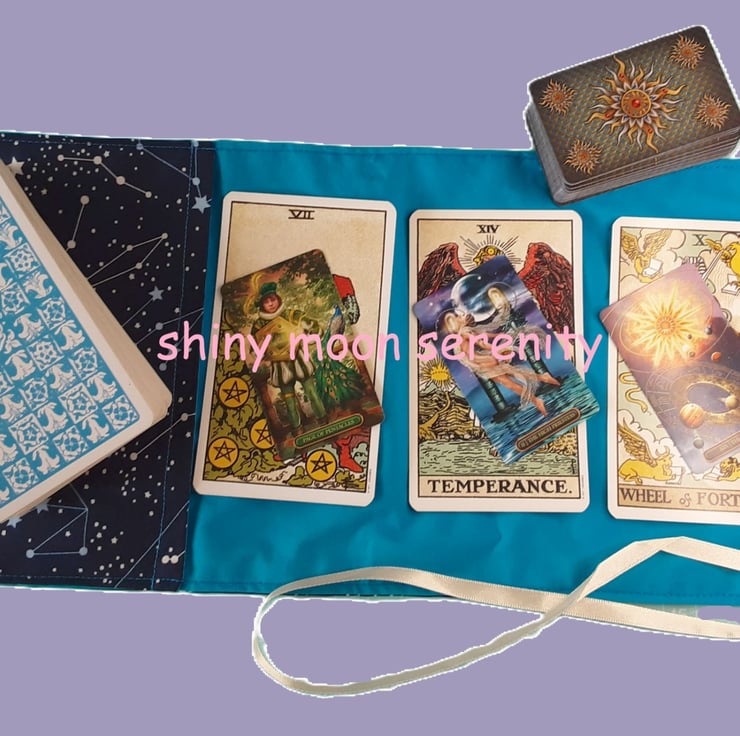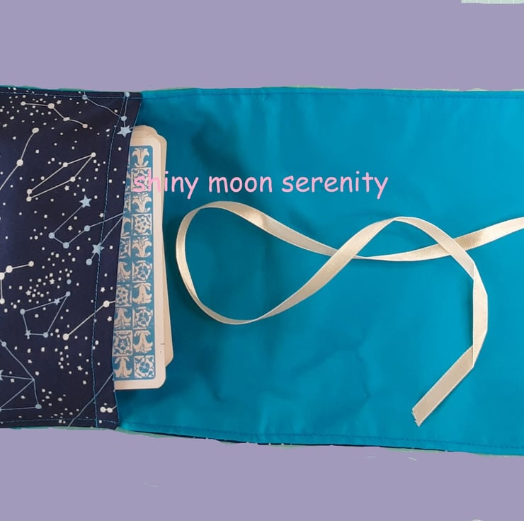 This wrap has a flat pocket at one end to hold your tarot/oracle cards. When unrolled there is enough room on the long flap to do a three card spread. It has printed fabric on one side and a plain fabric on the other with a ribbon tie. When the flap is folded around the pocket with the cards inside the tie wraps around to hold the flap in place. This will help to keep your cards safe when being transported.