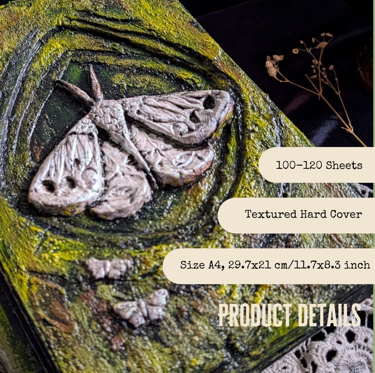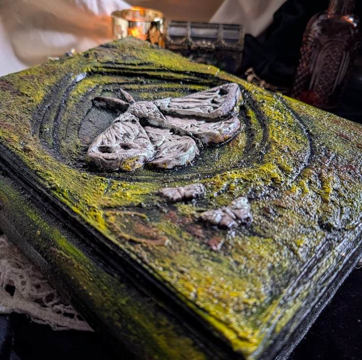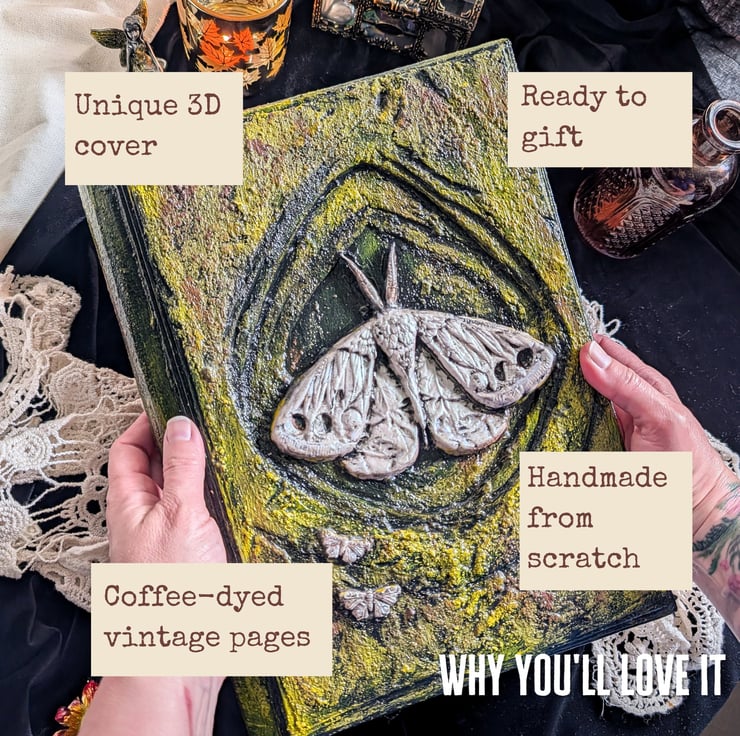 This is a handmade grimoire journal with a sculpted 3D moth cover and coffee-dyed vintage pages. Made for green witches, hedge witches, and enchanted forest lovers - works as a pagan altar piece, apothecary book, or witchy gift the moment it arrives.