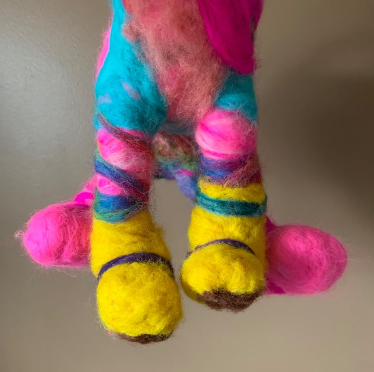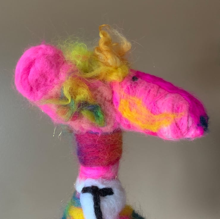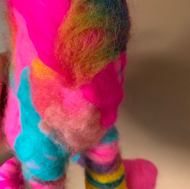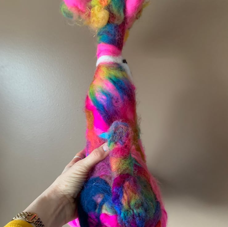 This vibrant, one-of-a-kind needle felted giraffe is bursting with colour and personality. Carefully sculpted by hand from wool, this whimsical creature features bold patterns, playful textures, and a charming character all its own.
