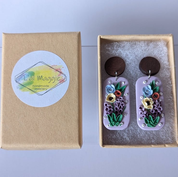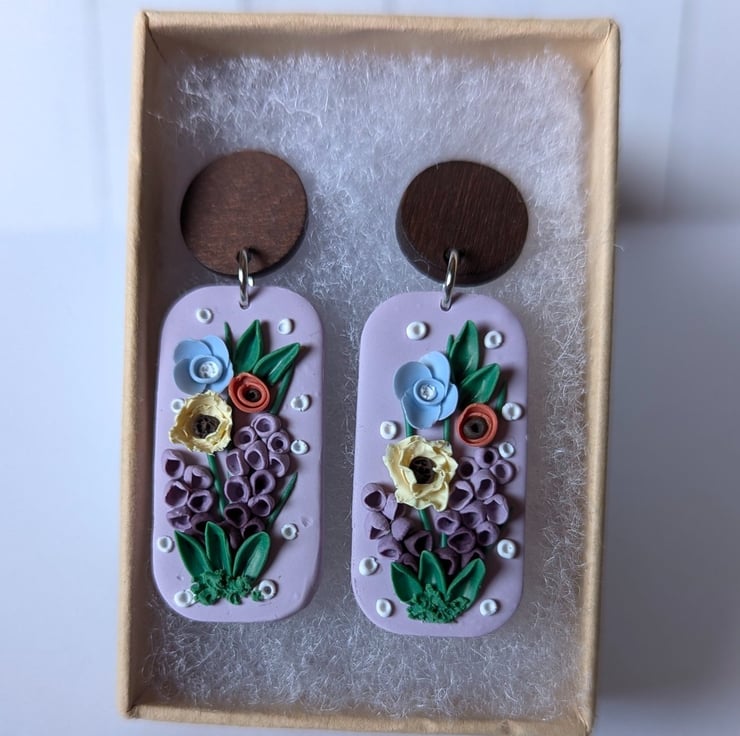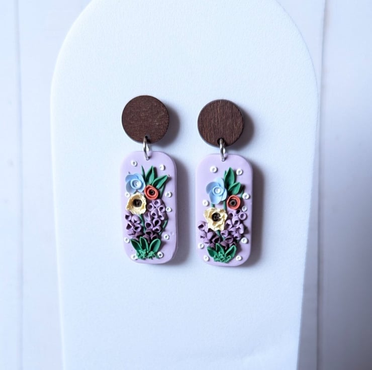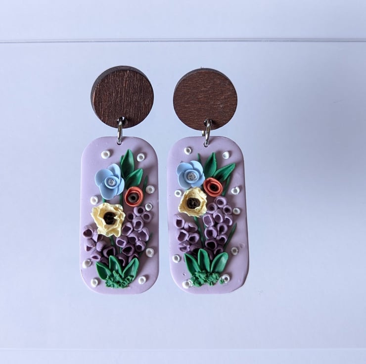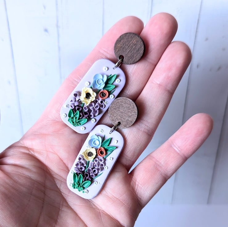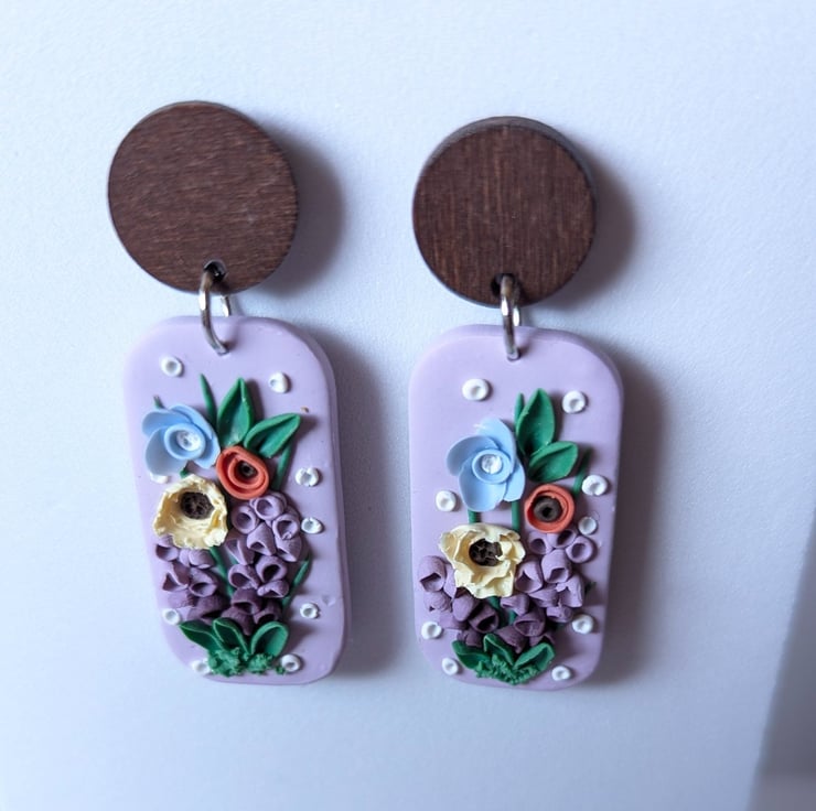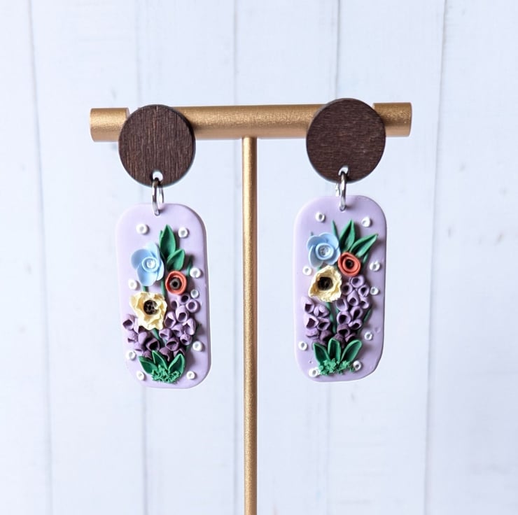Handmade from polymer clay, these are a beautiful and delicate mix of spring florals. Soft, pastel colours and white accents make for a gorgeous palette. They have stainless steel jump rings and a dark wood stud top with a stainless steel post.