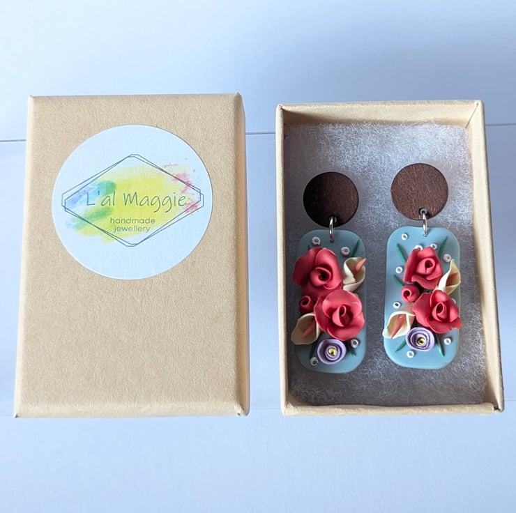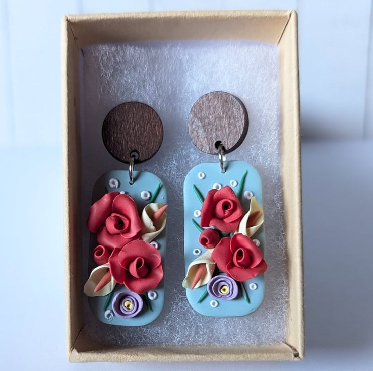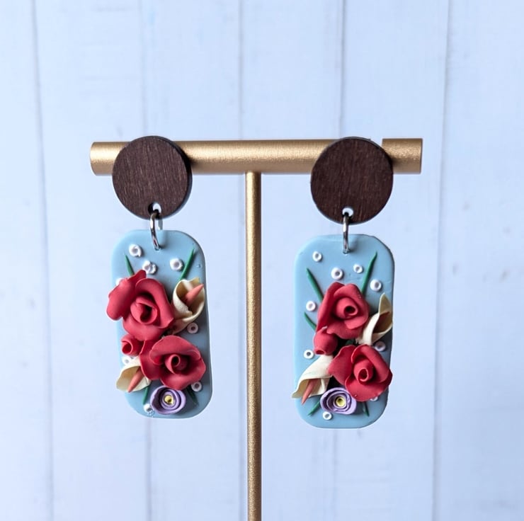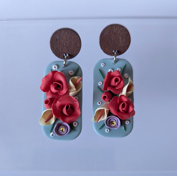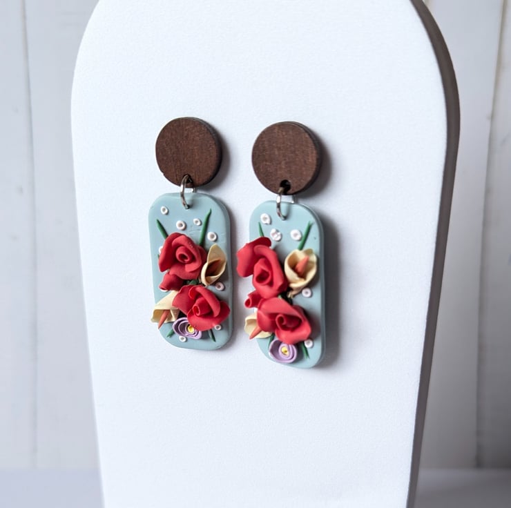 Handmade from polymer clay, these beautiful earrings have a muted pastel green base as a backdrop for handmade roses and lilies. They have stainless steel jump rings and a dark wood stud top with a stainless steel post.