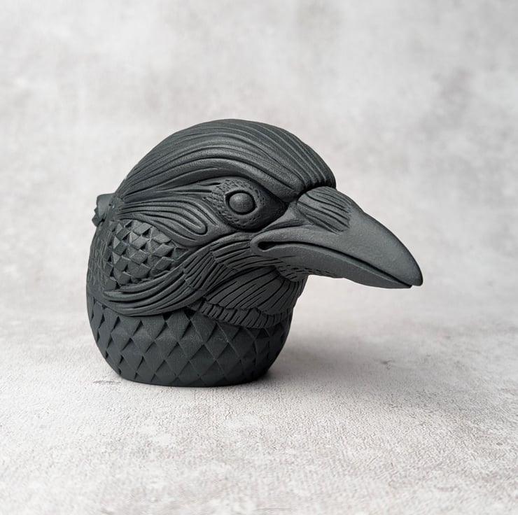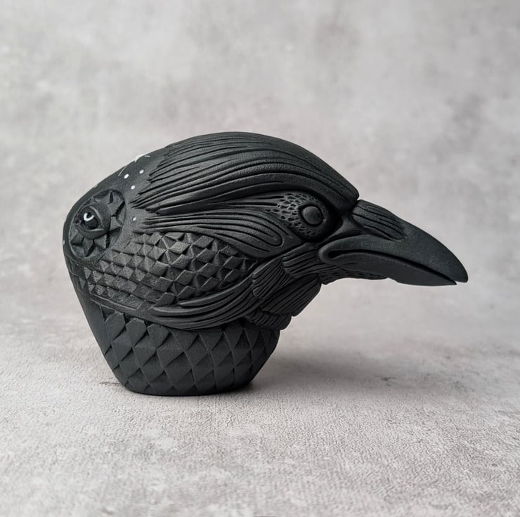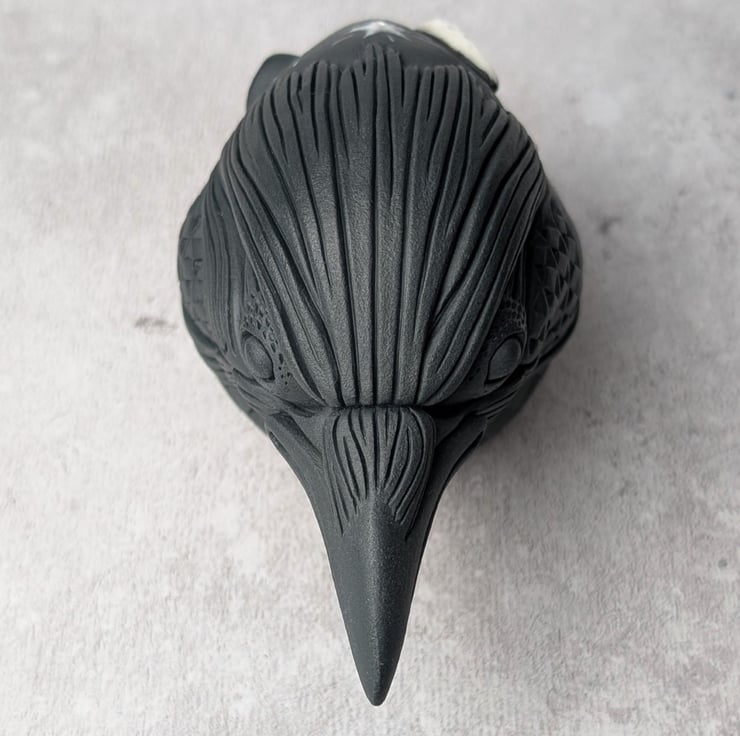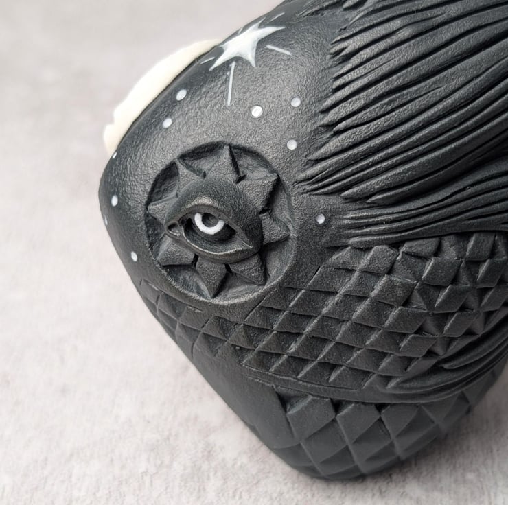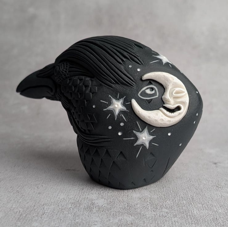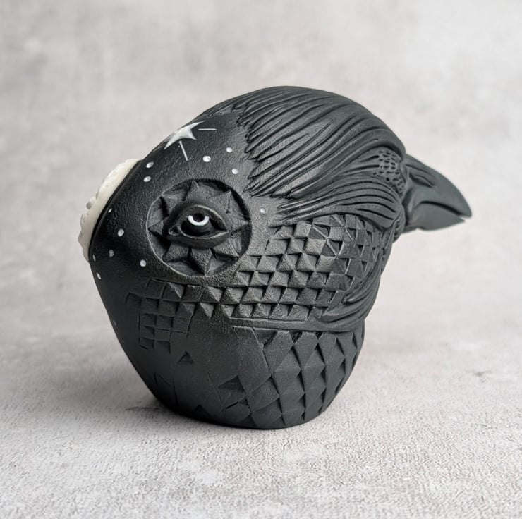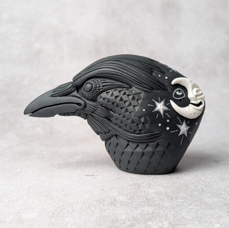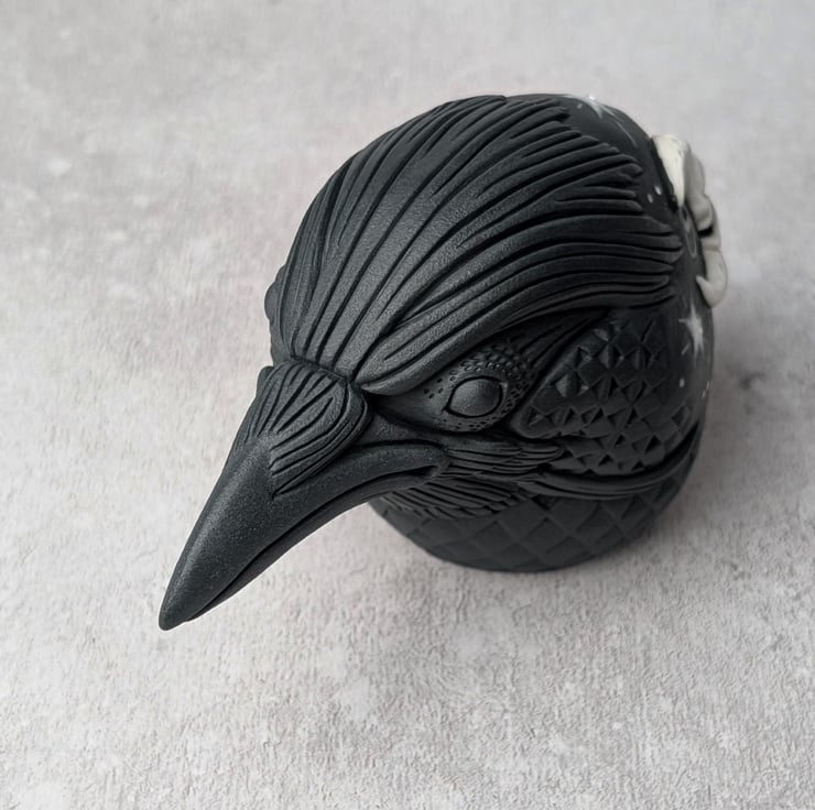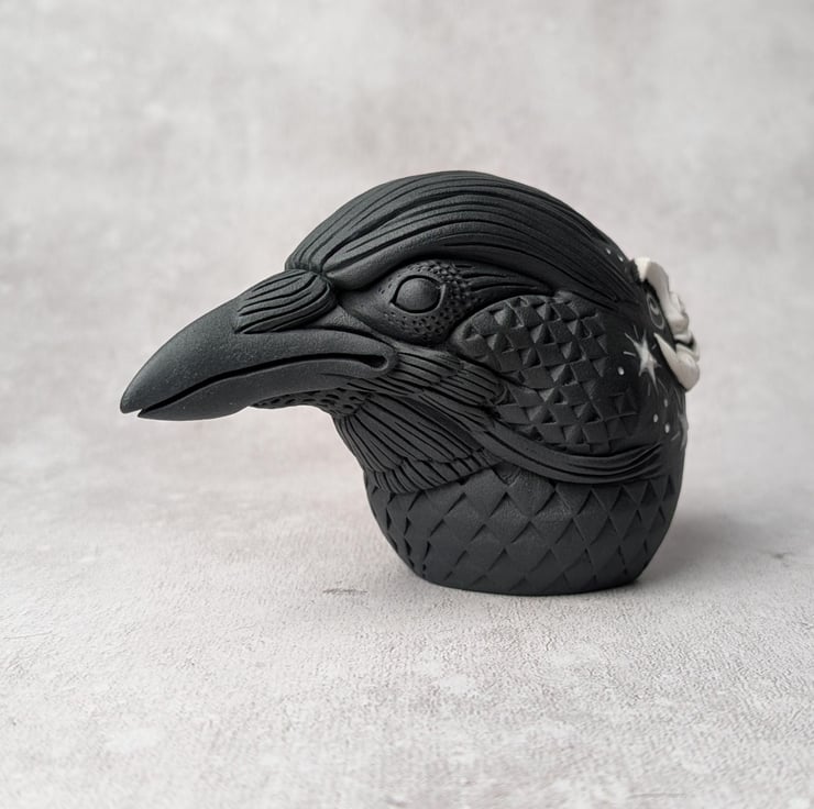 This crow idol is made primarily from black porcelain with an addition of a white porcelain crescent moon sprig. Astrum's moon sprig has been sculpted independently and carved into a laughing face, while the surrounding stars have been painted with white porcelain slip. The white porcelain elements have been enhanced with enamel. Astrum's feathers transform into a complicated abstract of hand carved diamond-like scales.