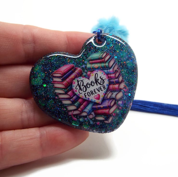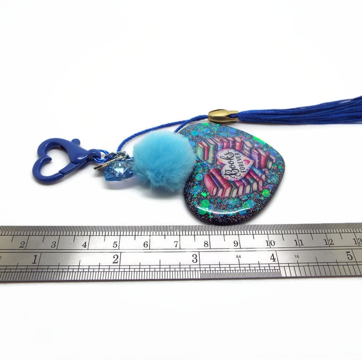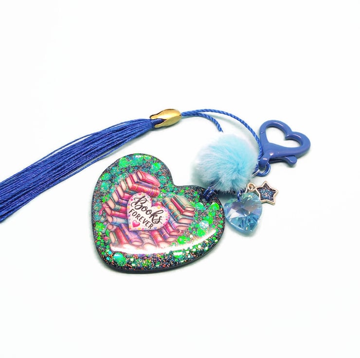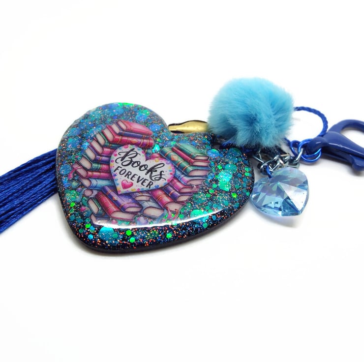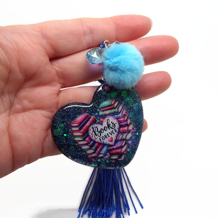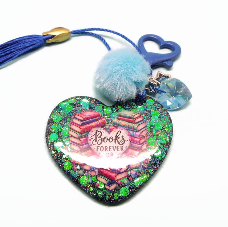 I've used a Dark Blue Heart Shaped Keyring Clasp to make this Bag Charm and added a matching Blue Tassel, Swarovski Heart Charm and a Pale Blue Fluffy Faux Fur Pompom. The main part of the Bag Charm is a 5cm Handmade Heart Resin Pendant. Using several layers of resin, I have embedded various glitters before adding the Books Forever sticker. I've added a final layer of resin to the front to ensure the sticker is totally secured. I've added a high quality black glitter holographic resin to the back.