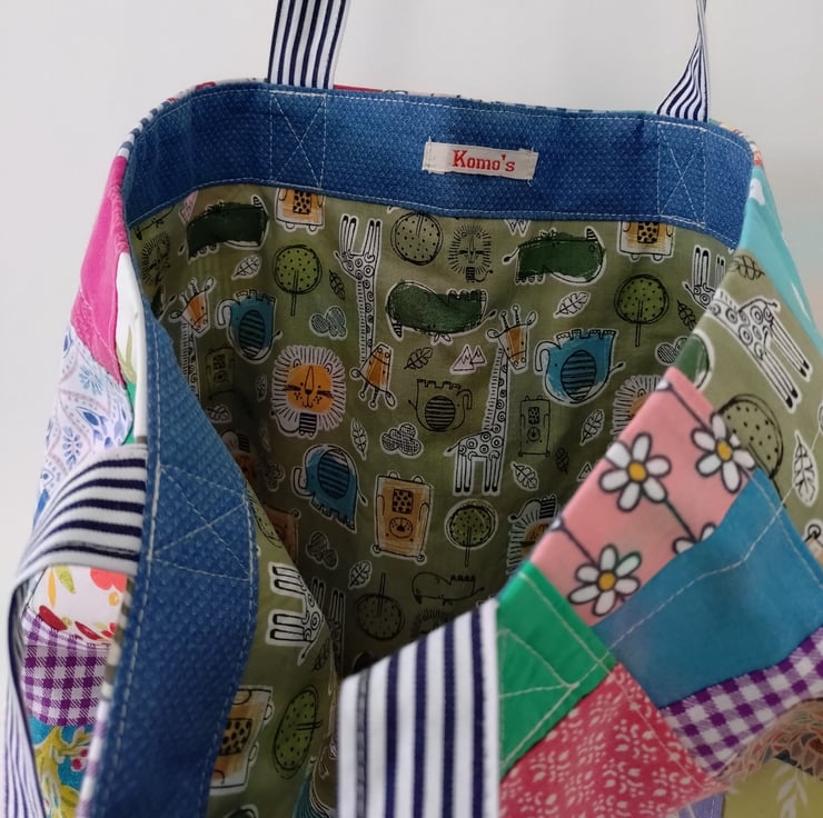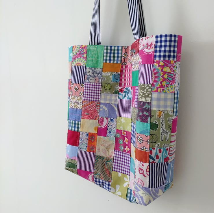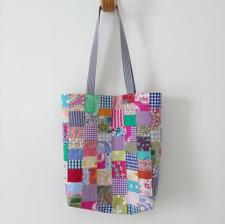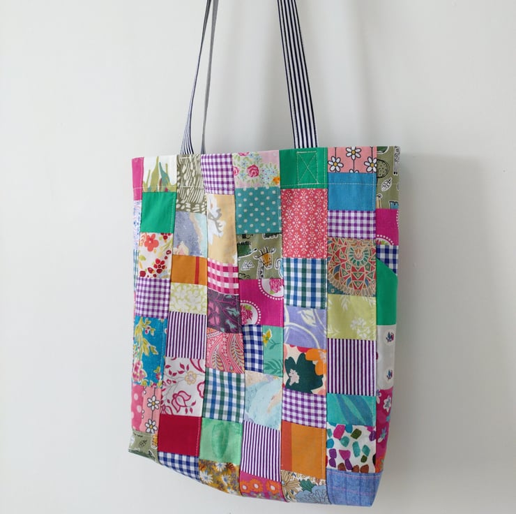 Upcycled cotton patchwork tote bag with long handle (A).