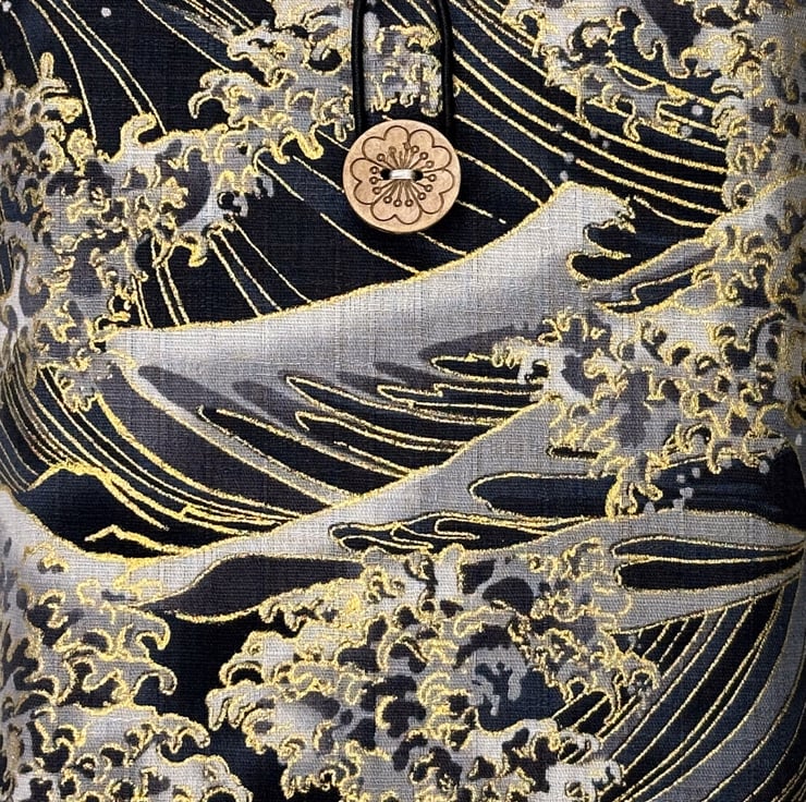 The fabric features a striking wave design in black, grey, and gold, inspired by traditional Japanese motifs and reminiscent of The Great Wave off Kanagawa by The Great Wave off Kanagawa. The flowing crests and subtle gold accents symbolise strength, movement, and the enduring beauty of nature in Japanese art.