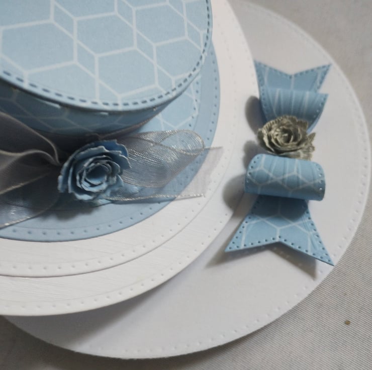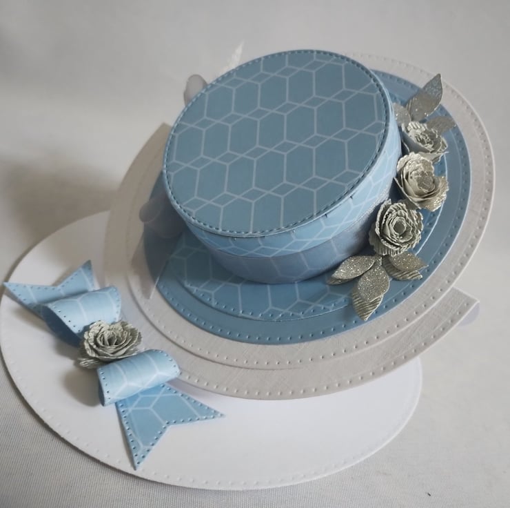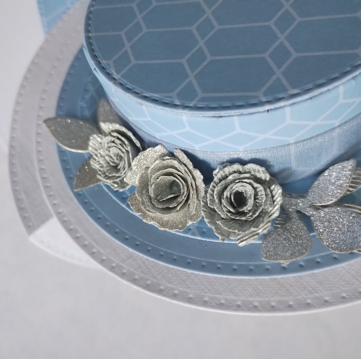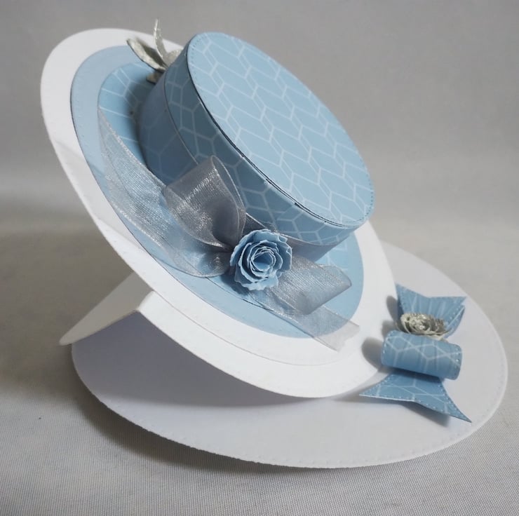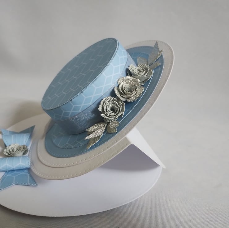 A beautiful blue hat is the feature of this easel card. I've made the hat from lovely blue cardstock, made some silver roses in different tones and cut some silver leaves to decorate along with some silver grey organza style ribbon. I've made a cardstock bow from the same card to act as the 'stopper' and added another rose to the centre for extra interest and dimension.