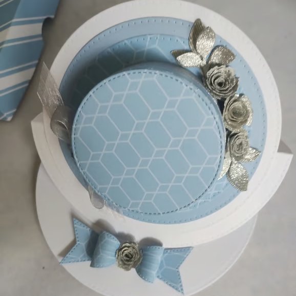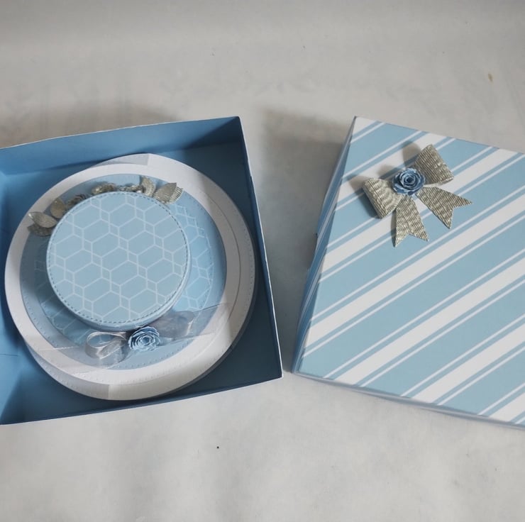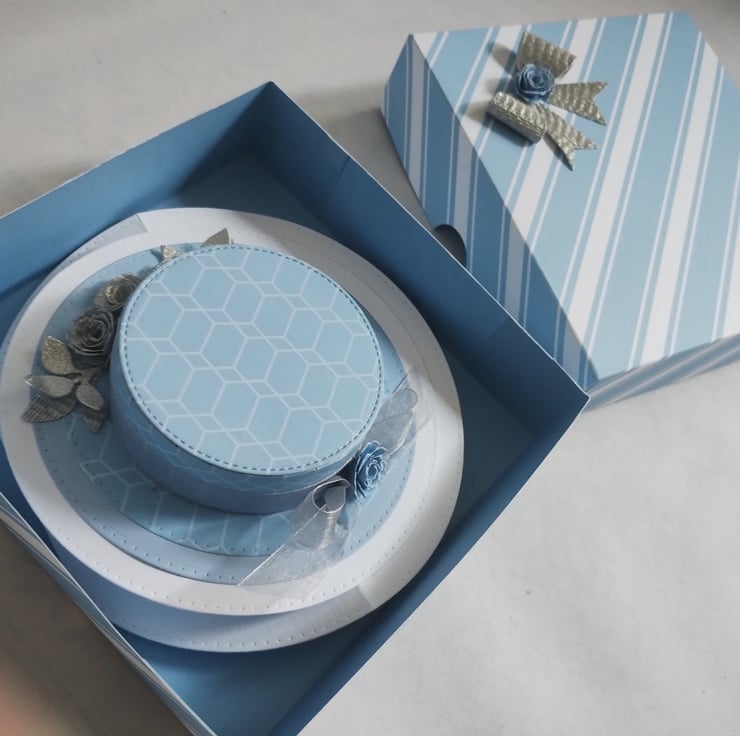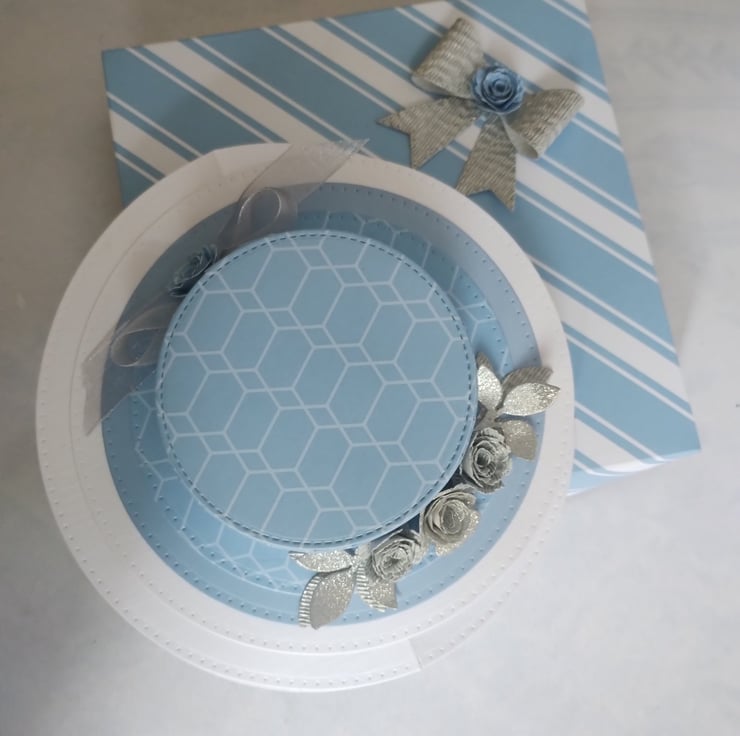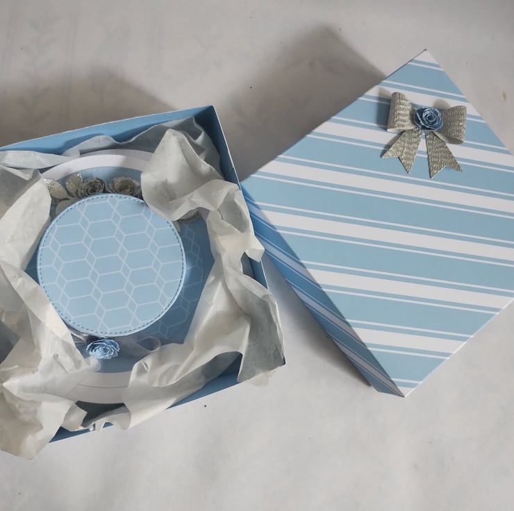I've also made a lovely blue bold striped box with a matching silver bow and another rolled rose to decorate.