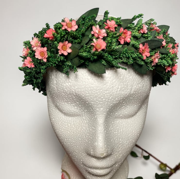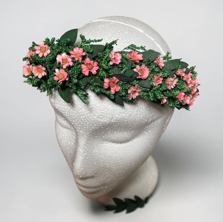 Bring a touch of nature to your special day with this beautiful, folksy-style flower crown. Handcrafted using naturally dried pink blossoms and preserved evergreen foliage, this headpiece offers a timeless, organic look that will never wilt.