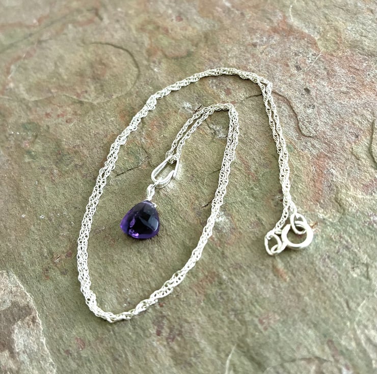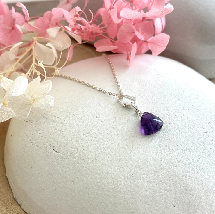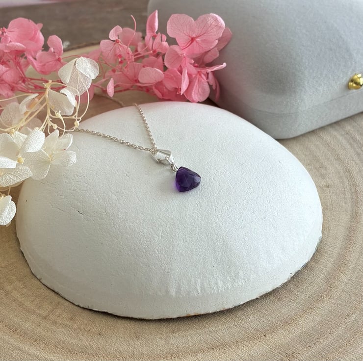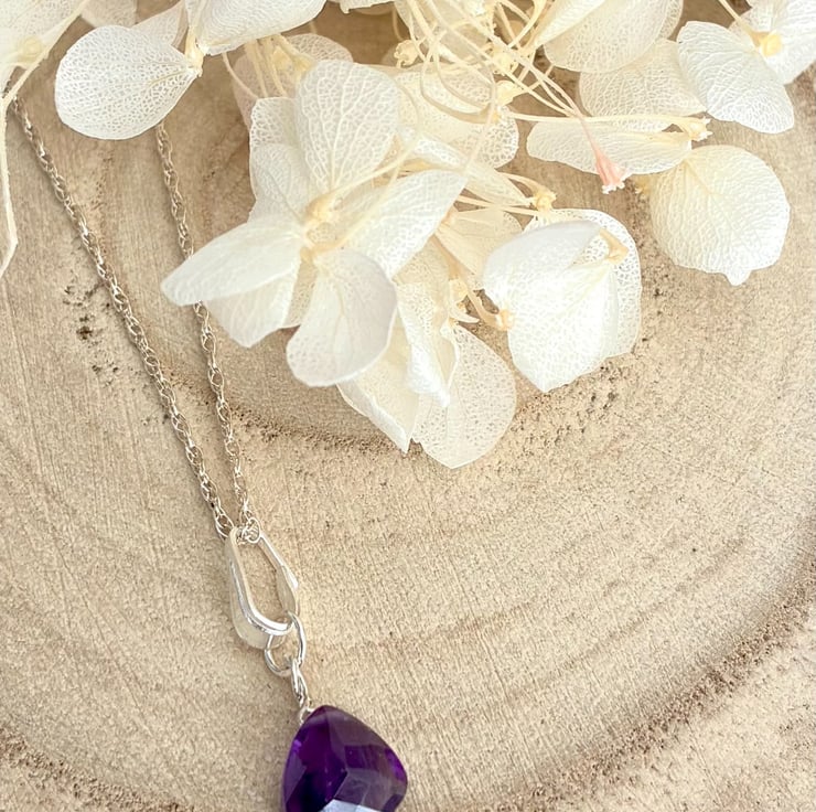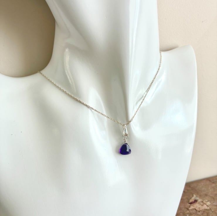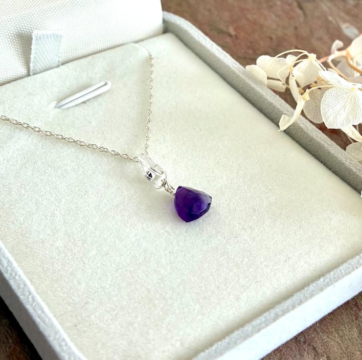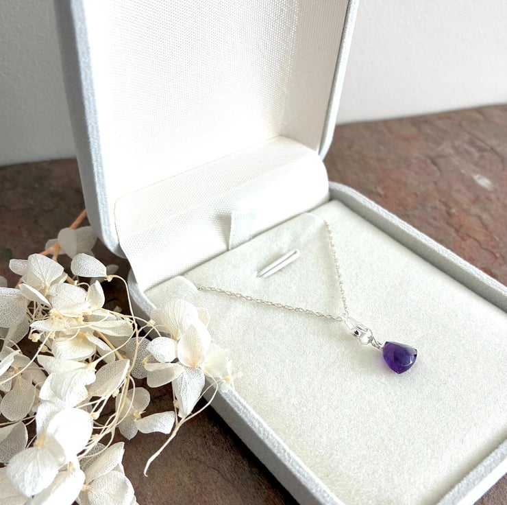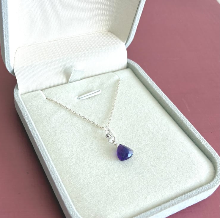 This lovely pendant features faceted surfaces with a subtle peak on one side. Sourced from Brazil, the gemstone is notable for its exceptional clarity with minimal inclusions and displays a rich grape hue. The pendant is presented on a 16 inch (40cm) rope chain necklace composed of 1mm links and secured with a spring ring clasp. The piece is packaged in a pale grey, flocked gift box with a hinged lid.