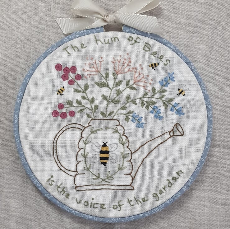 This pretty floral wrapped embroidered hoop . Backed with pink felt and finished with a cream silk bow. 15 cm diameter.