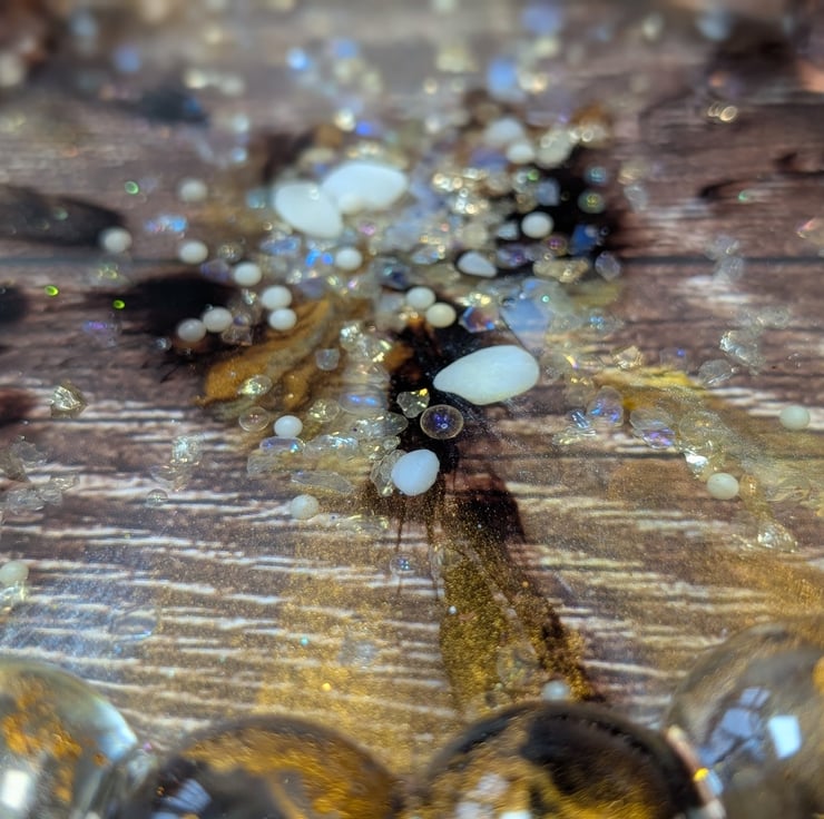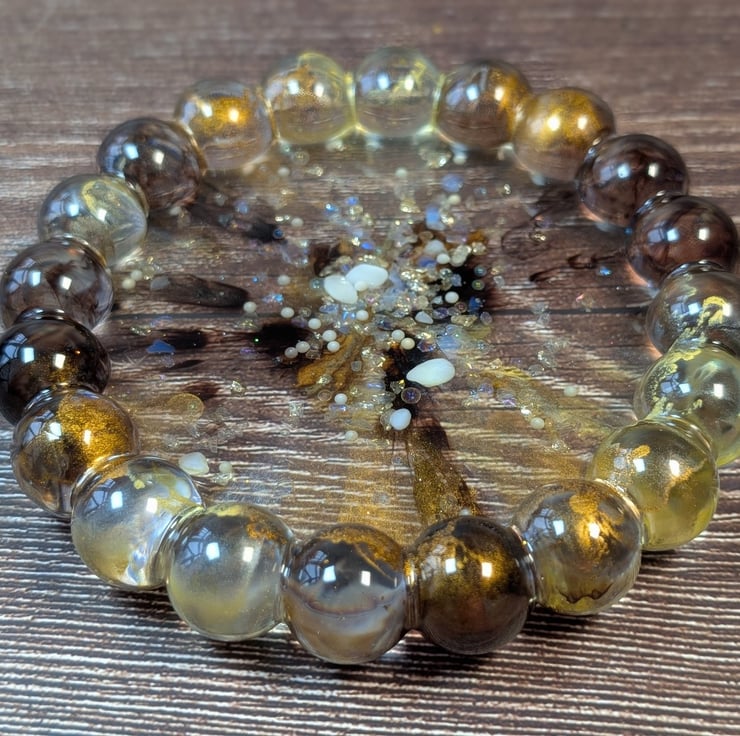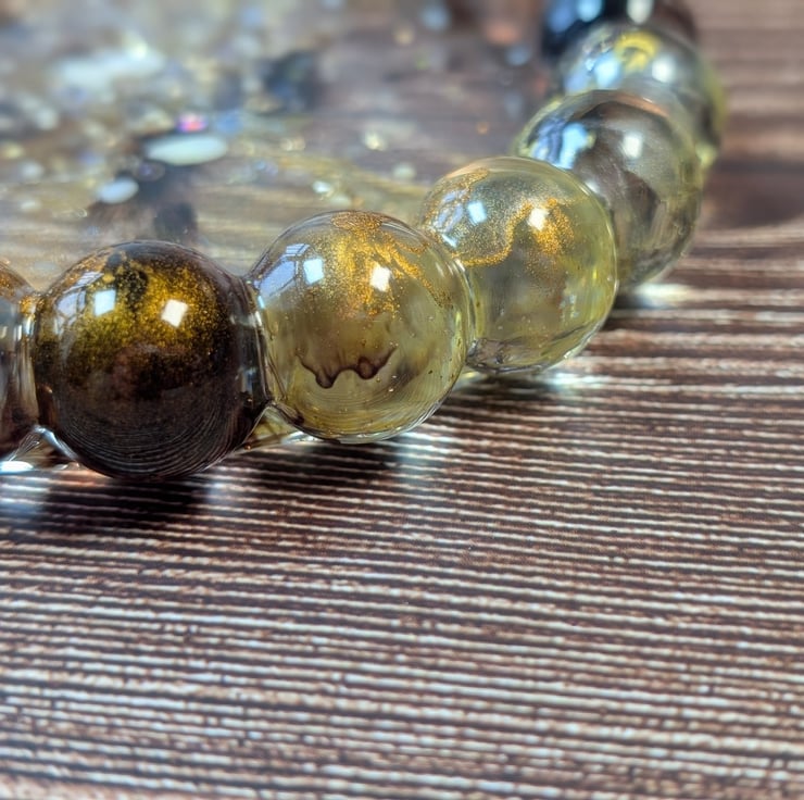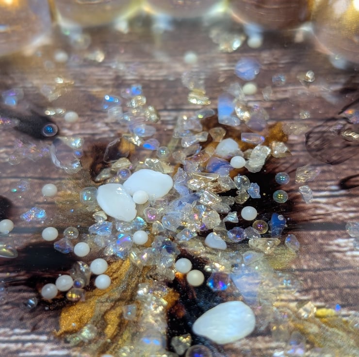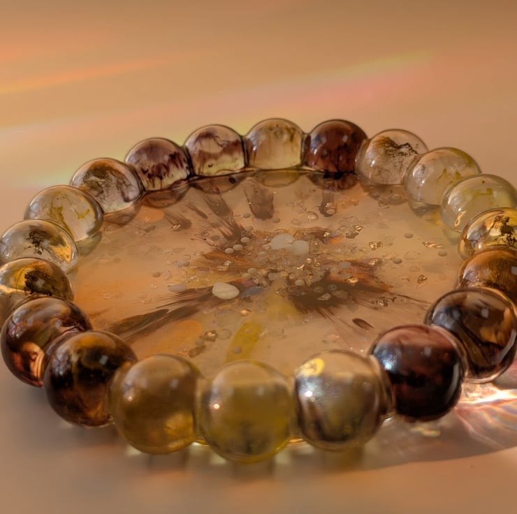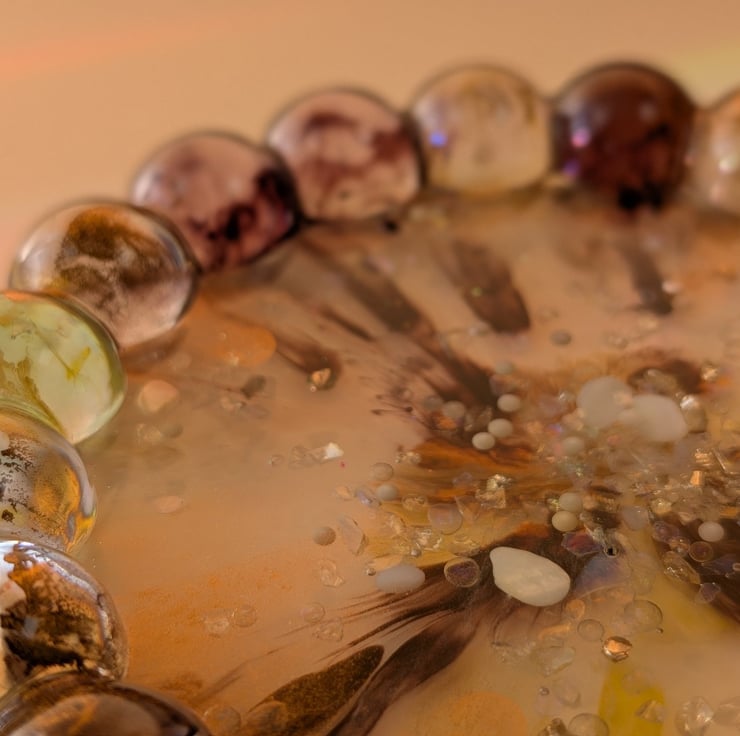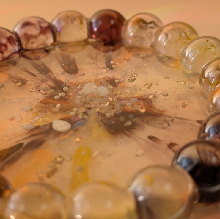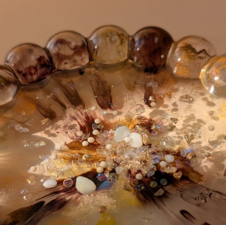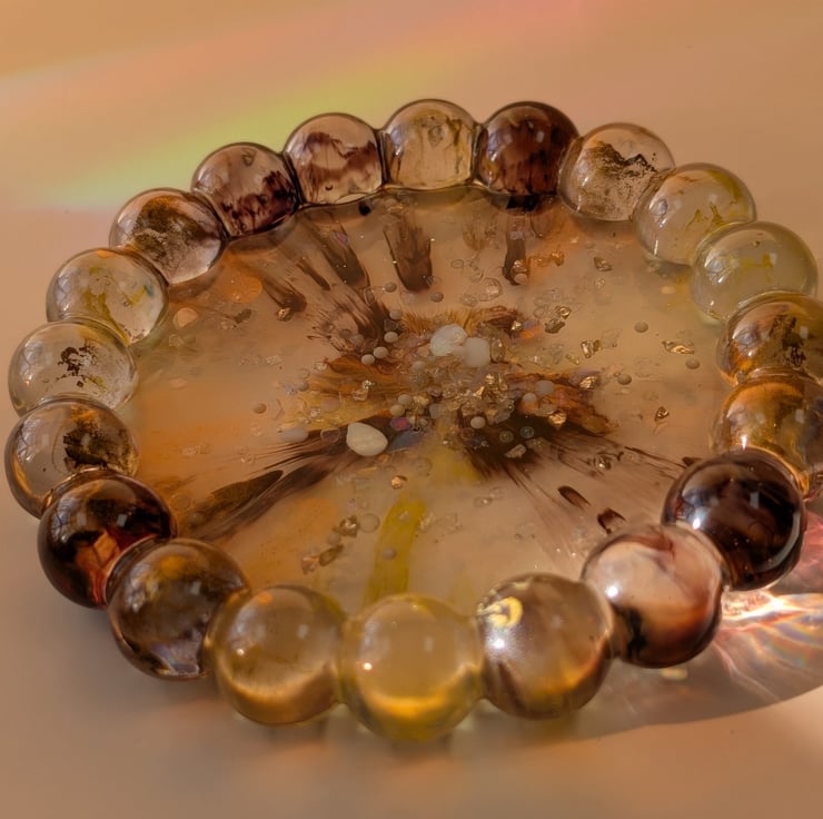 A warm, atmospheric bubble-rim tray with a dramatic geode-style centre. Gold, smoke, and amber tones swirl together around a cluster of iridescent crystals and pearlescent beads, giving the piece real visual depth. The glossy bubble border shifts from golden honey to deep espresso, catching the light from every angle.