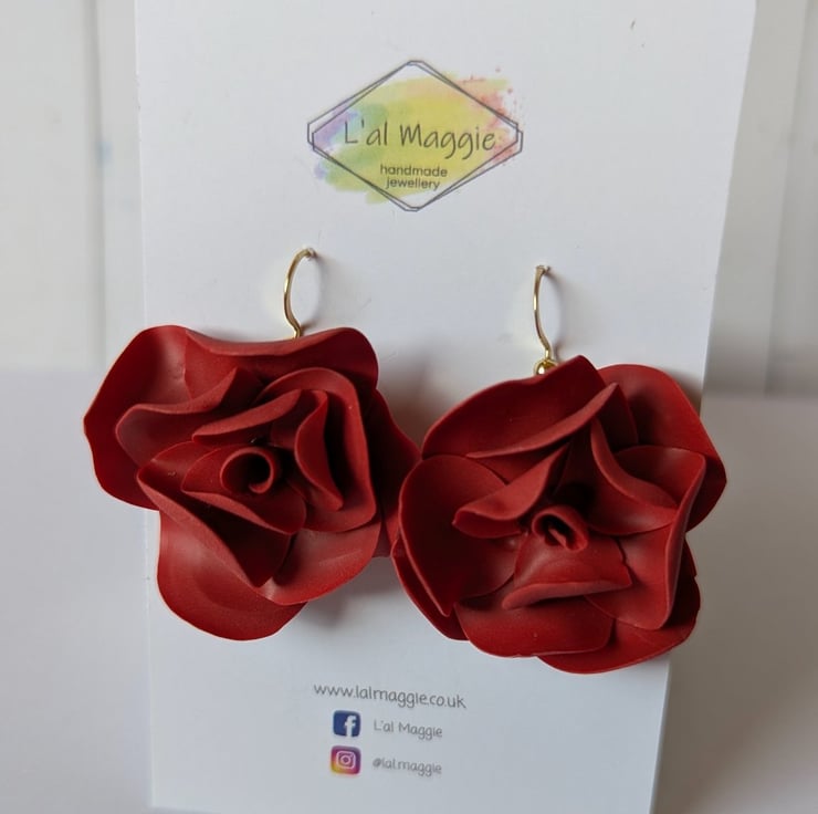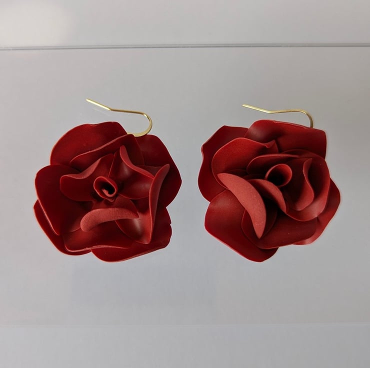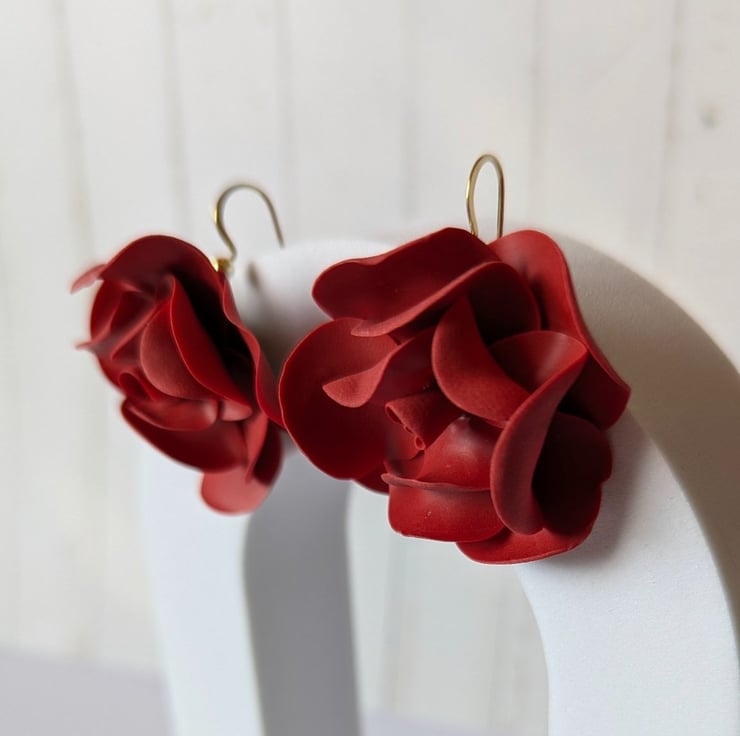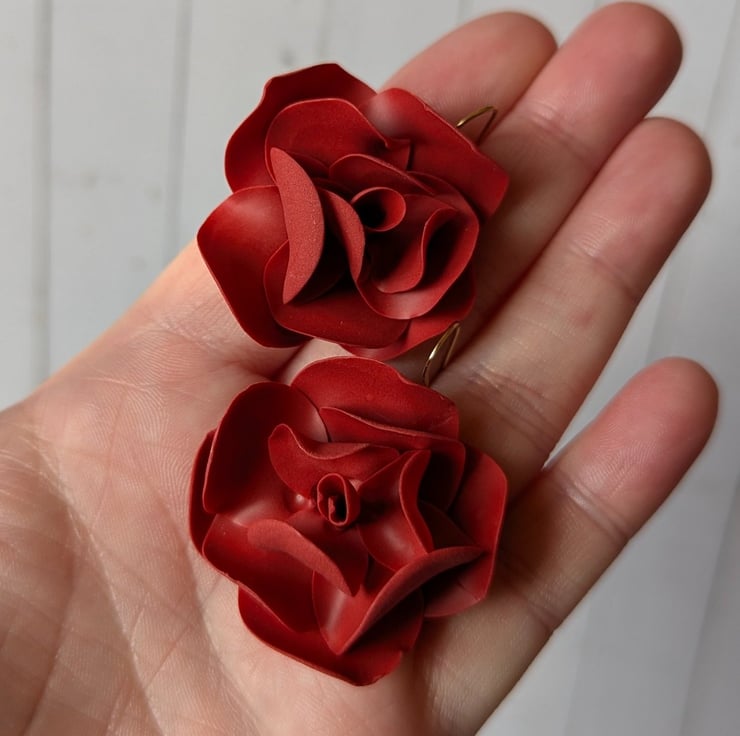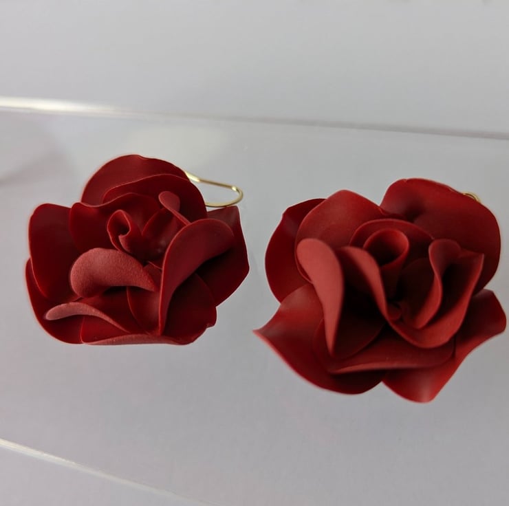 Soft and simple, these red rose earrings are hung from a stainless steel hook.