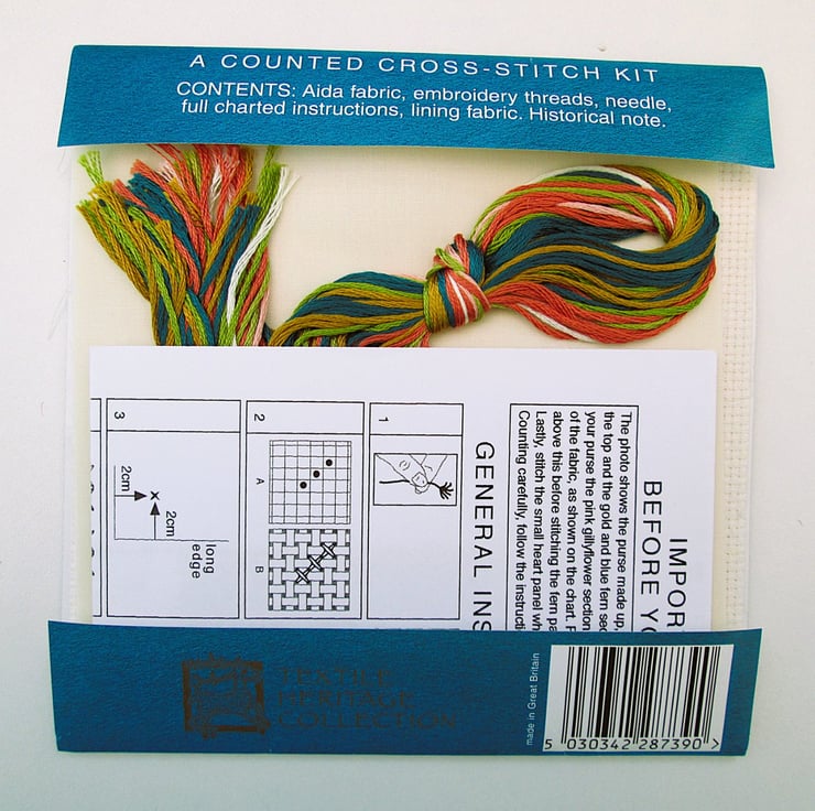 Kit includes aida fabric, threads, needle, instructions and lining fabric