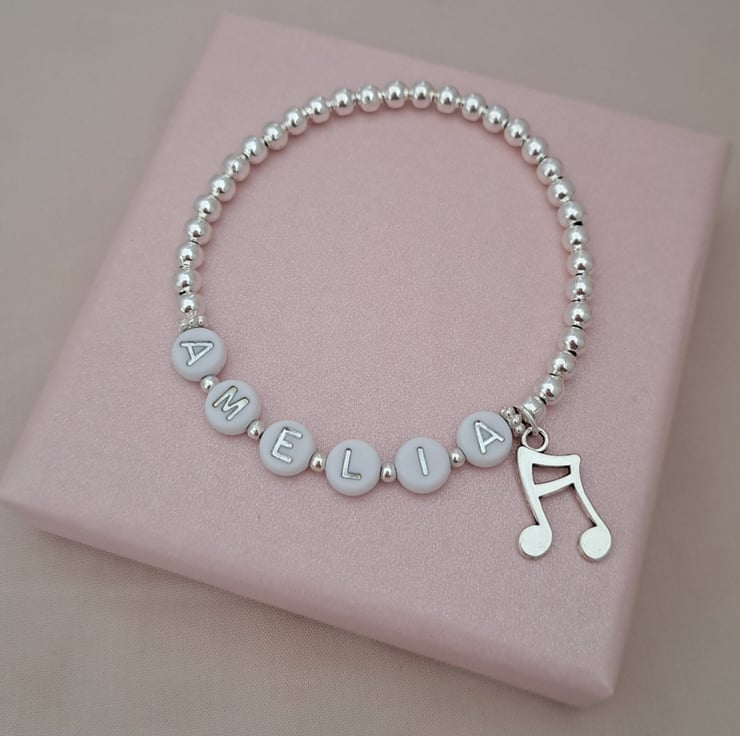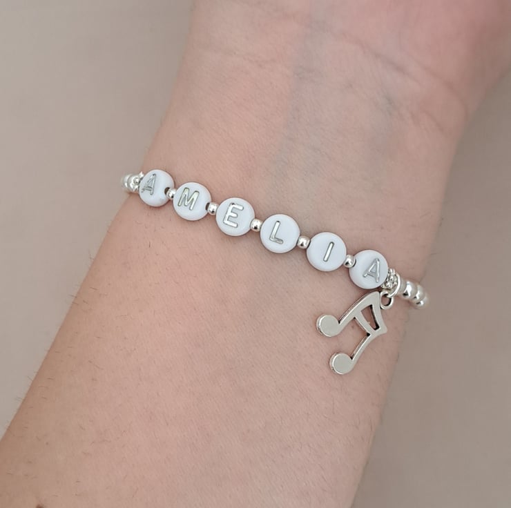 A beautiful personalised silver beaded bracelet, handmade with white letter beads and a musical note charm for a meaningful finishing touch. This stretchy bracelet makes a lovely gift for music lovers and a special keepsake for birthdays, special occasions or everyday wear.