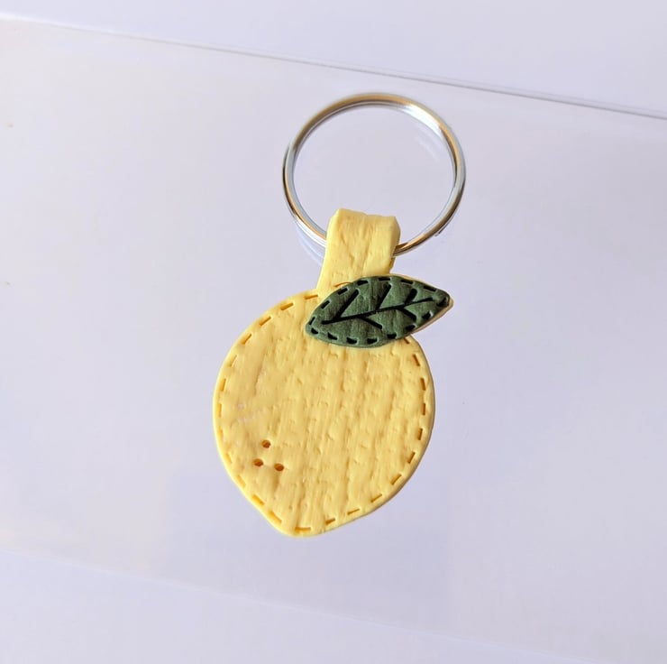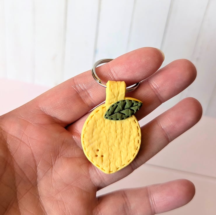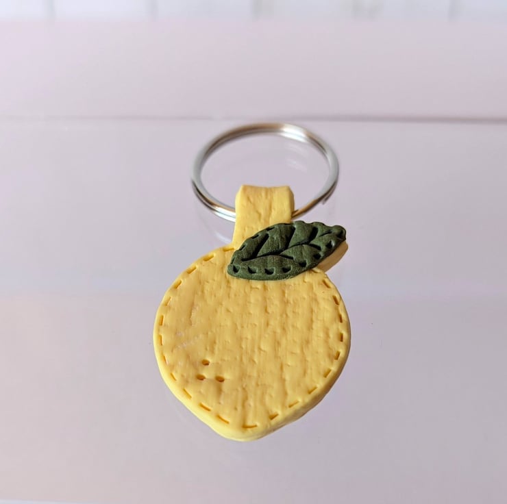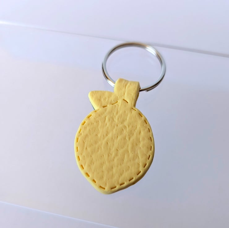 This lemon keychain is super sweet. It has a leather textured effect and faux stitching. Lightweight and with a stainless steel keyring, it's the perfect gift for fruit lovers.