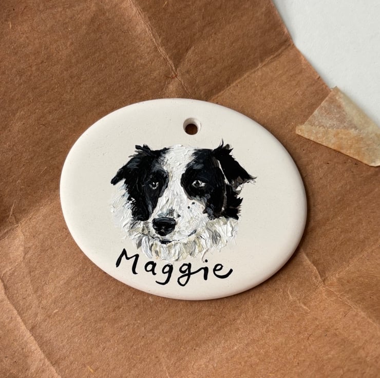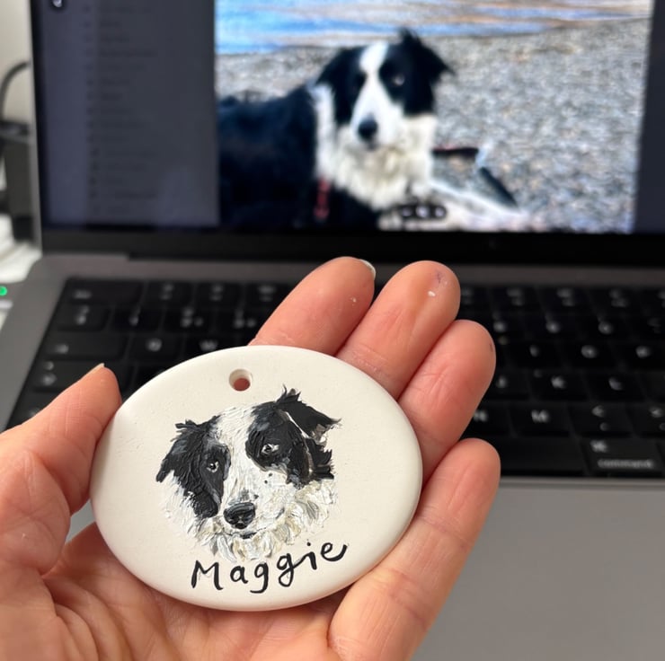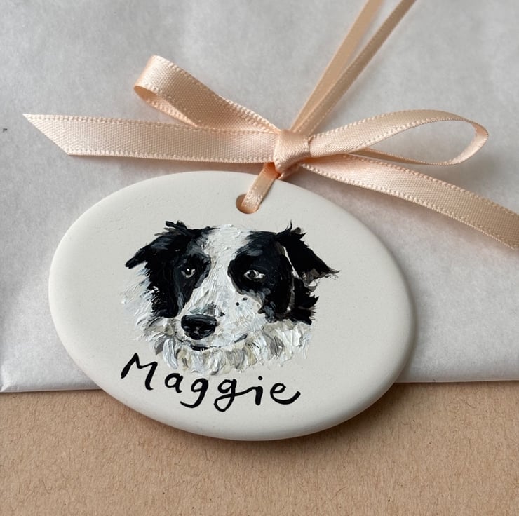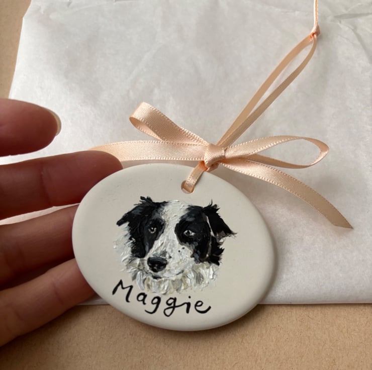 Each ceramic decoration measures approximately 6cm x 5cm and is individually illustrated using a reference photo of your pet (provided by you) and transformed into a unique keepsake featuring your dog's name. Finished with a ribbon tie and beautiful bow (in the colour of your choice) it is ready to be gifted or enjoyed in your home.
