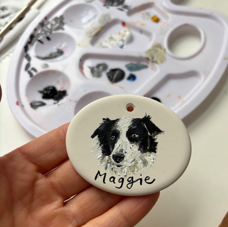 A hand-painted dog portrait decoration, lovingly illustrated by Lizzie Martell.