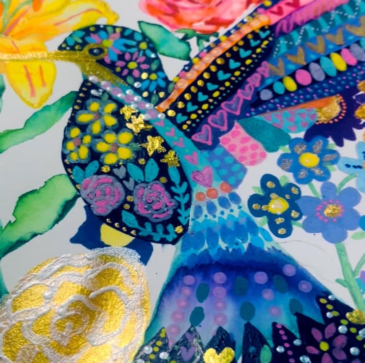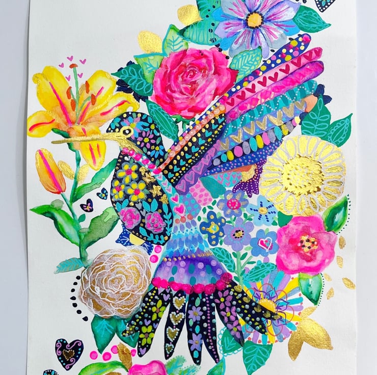 Hummingbird and flowers on paper, unframed and measuring A4. Signed and dated on the back. Created using acrylic paint, pens, watercolour and golf leaf