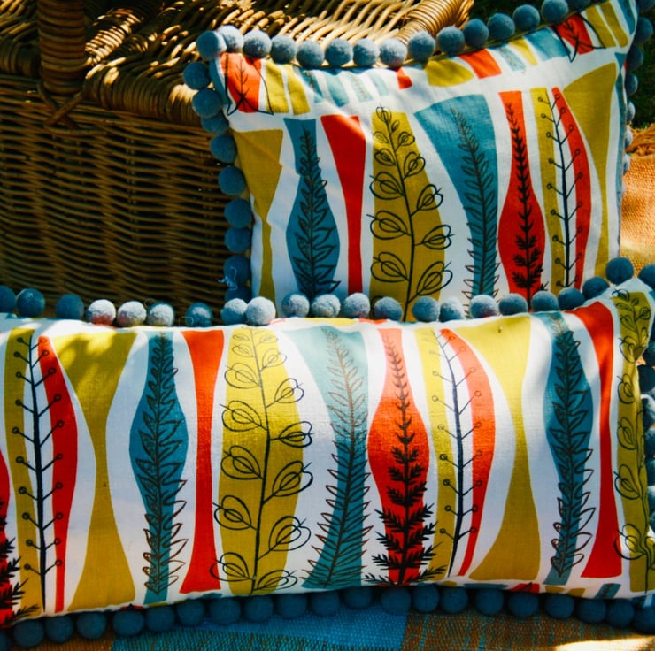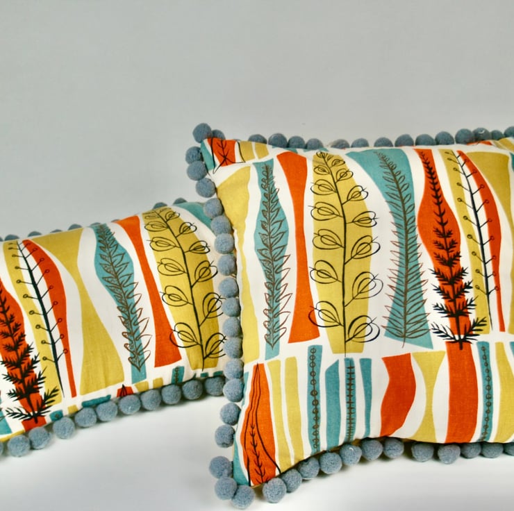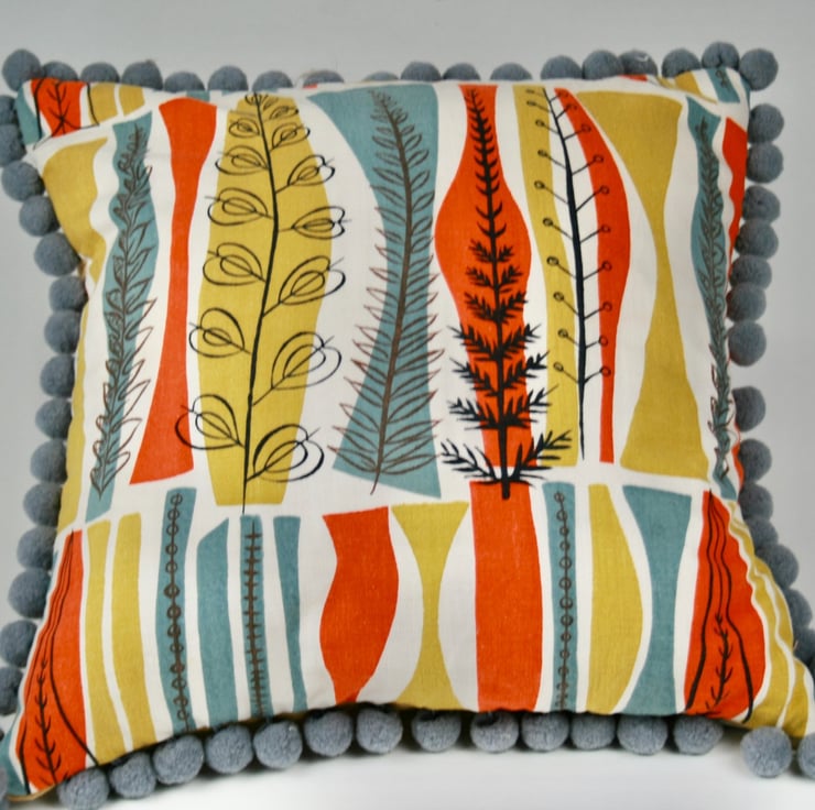 MID CENTURY style to go with that Mid Century look you are cultivating. And this is the real thing. The fabric in these cushions are original Mary White design- COPPICE- from late 1950s. Examples of her work are held in the Victoria and Albert Museum and the Whitworth Gallery in Manchester. The fabric has been in my collection for a long time and is now ready to enhance the renewed styling of Mid Century Design. Your own piece of real design history. They are made to a professional standard. The design fabric is lined as well to ensure the fabric is protected during use. They are finished with new grey pompom bobbles, a fashionable feature of the era, an invizable zip and filled with a quality feather inner. They are priced separately.The Square one on this listing is 40 x 40 cm and has a gold back. £70.00. The long one is 30 x61 cm and has a cream back and will be listed separately at £70. Don't miss out on an original piece of Mid Century History.