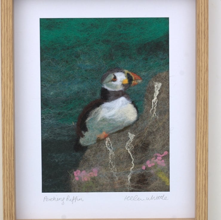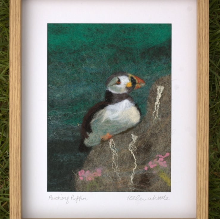 This original piece is wet felted with needlefelt embellishment. It shows a gorgeous Puffin perched on a summer cliff and is designed and signed by the artist.