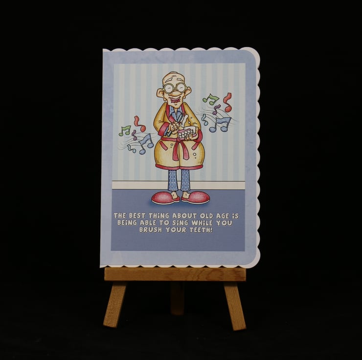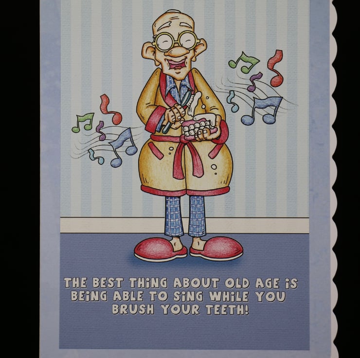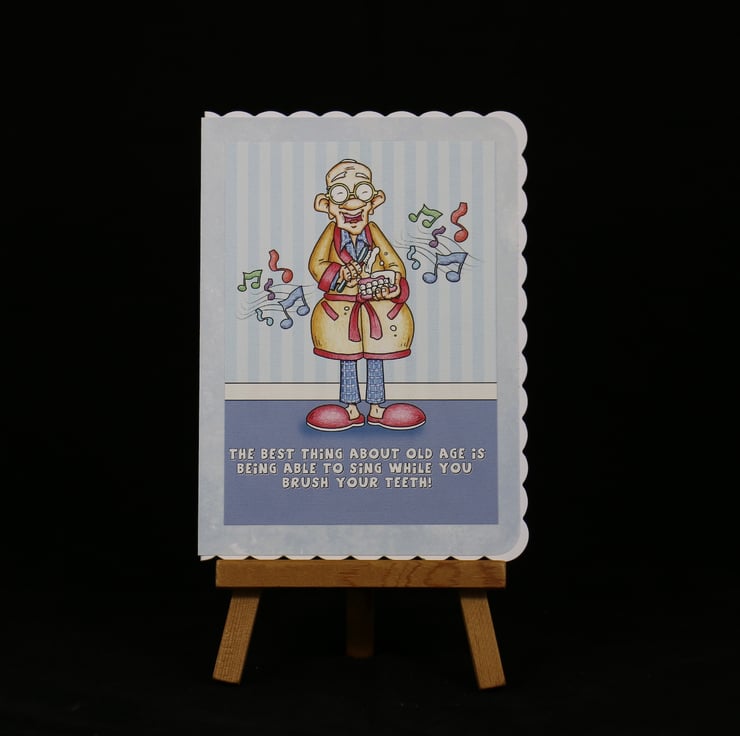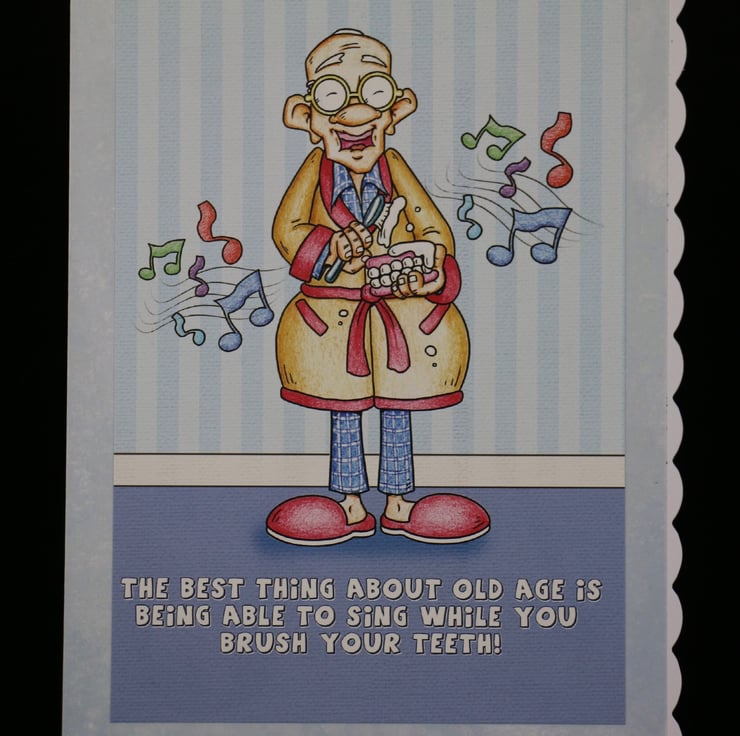 I layered the humorous topper onto blue backing card, and then onto a white, scallop-edged card.