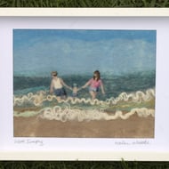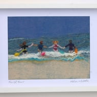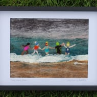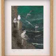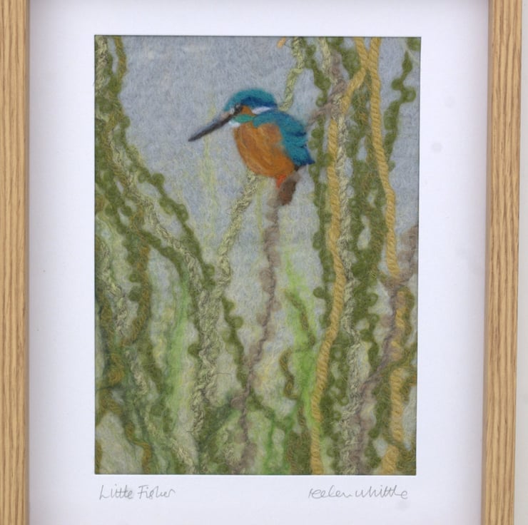 This original piece is wet felted with needlefelt embellishment. It shows a jewel-like Kingfisher perched in waterside vegetation and is designed and signed by the artist.