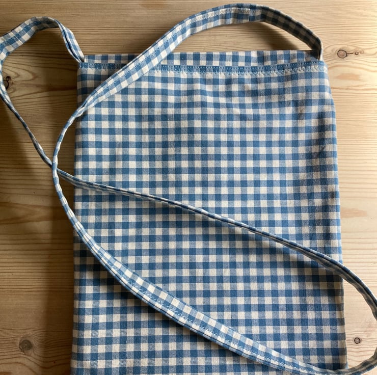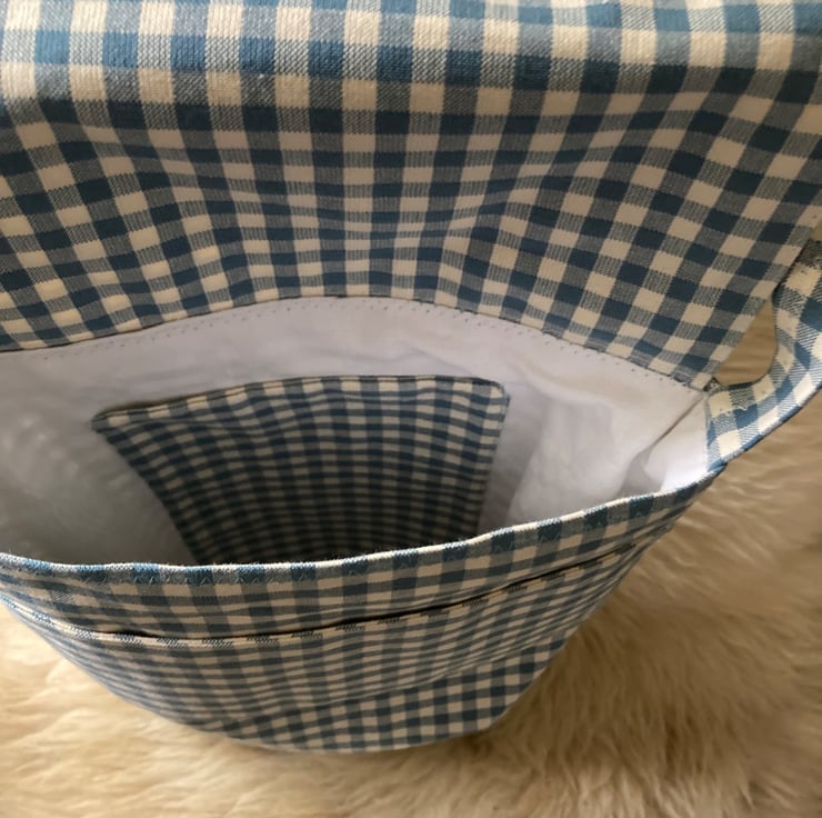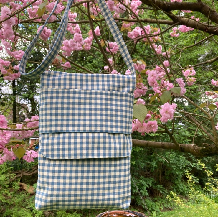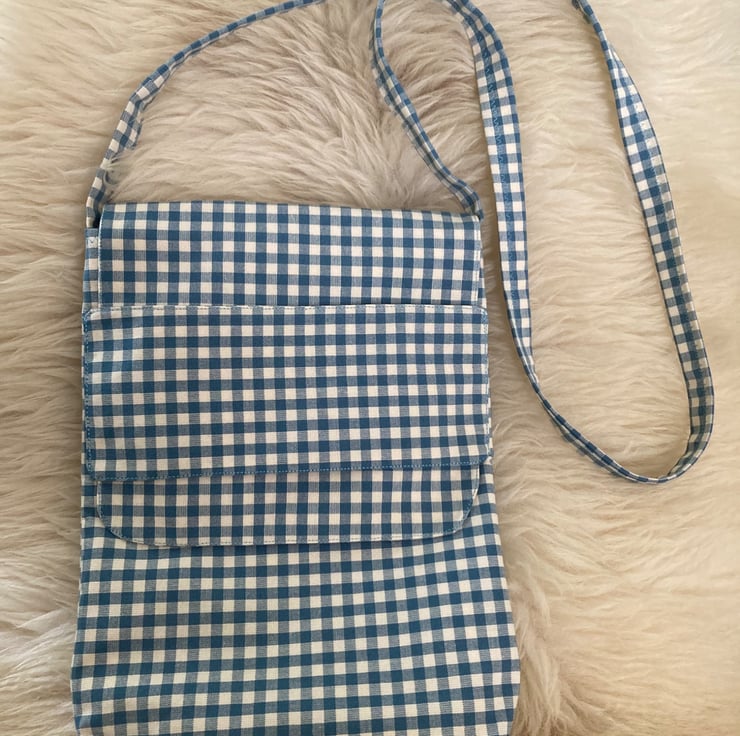Crafted from strong but lightweight cotton canvas in a pale blue check design, the "Calin" crossbody bag is styled for any occasion. Designed with a contrasting inner pocket and lined in French cotton this practical bag has enough room inside for all your daily essentials. Measurements are 31 cms from base to rim, 23 cms in width and 122 cms in length of strap. Perfectly stylish and sleek, a stand out piece for a day at the office or an evening on the town !