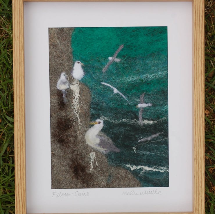 This original piece is wet felted with needlefelt embellishment. It shows a Fulmar breeding colony (not a whole one!) and is designed and signed by the artist.