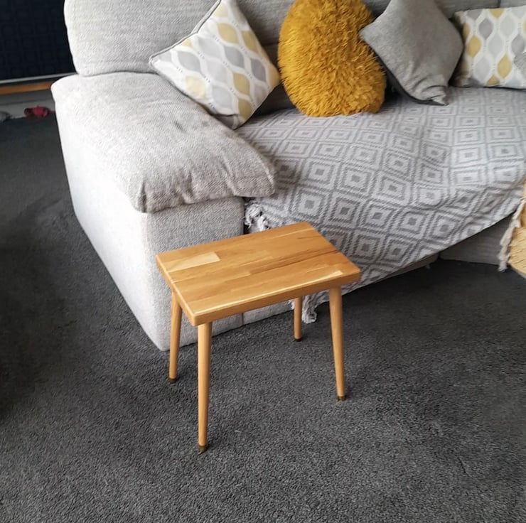 The 27mm thick solid oak top is sanded smooth and finished with layers of danish oil and beeswax to give it a water resistant durable finish. The 30mm beechwood tapered legs have been sanded to a smooth finish and also finished with danish oil. The legs are 40cm long and come packed flat and are easily screwed to the metal mounting plated attached.