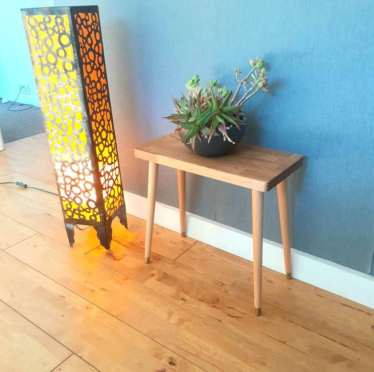 This handy wooden side table is handmade and features slim tapered legs.