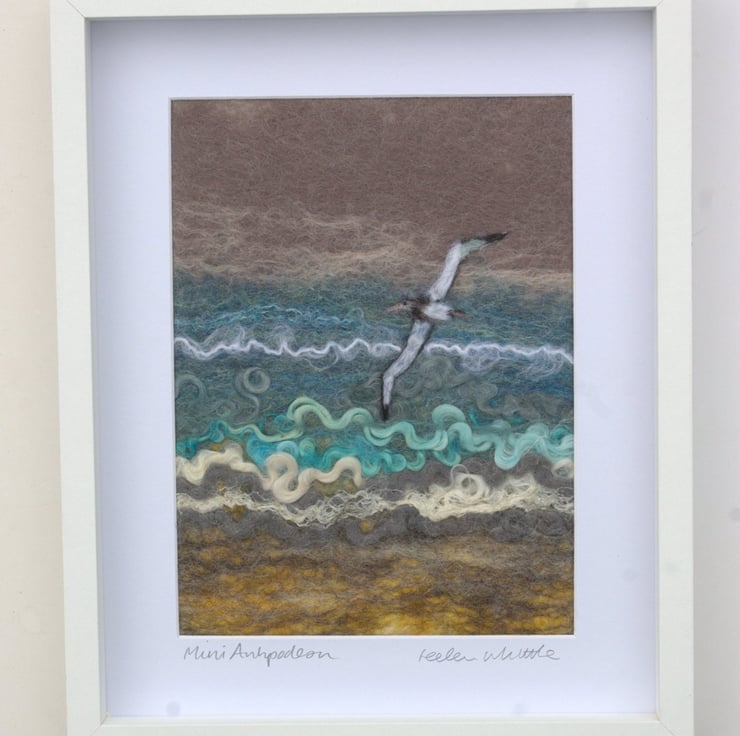 This original piece is wet felted with needlefelt embellishment. It shows an Antipodean Albatross gliding over the sea and is designed and signed by the artist.