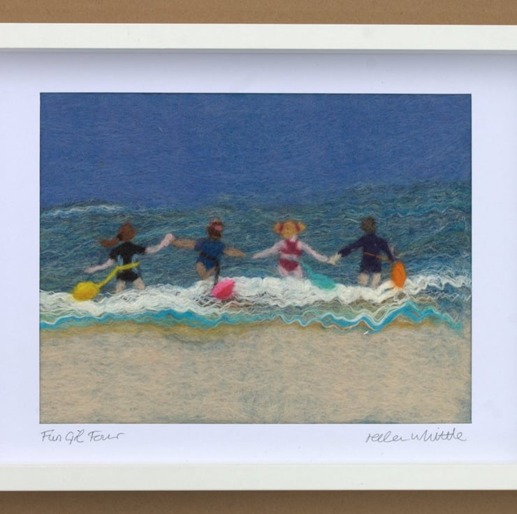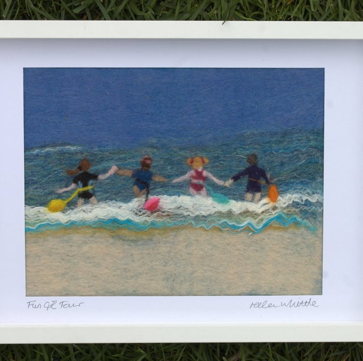 Original wet-felted art with needle-felted embellishment. This piece show four swim buddies enjoying the waves and is designed and signed by the artist.