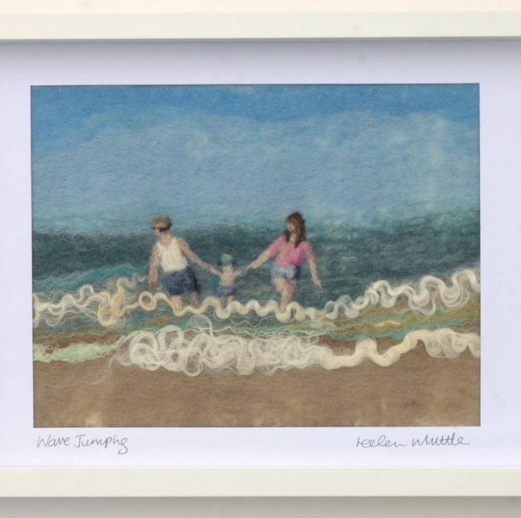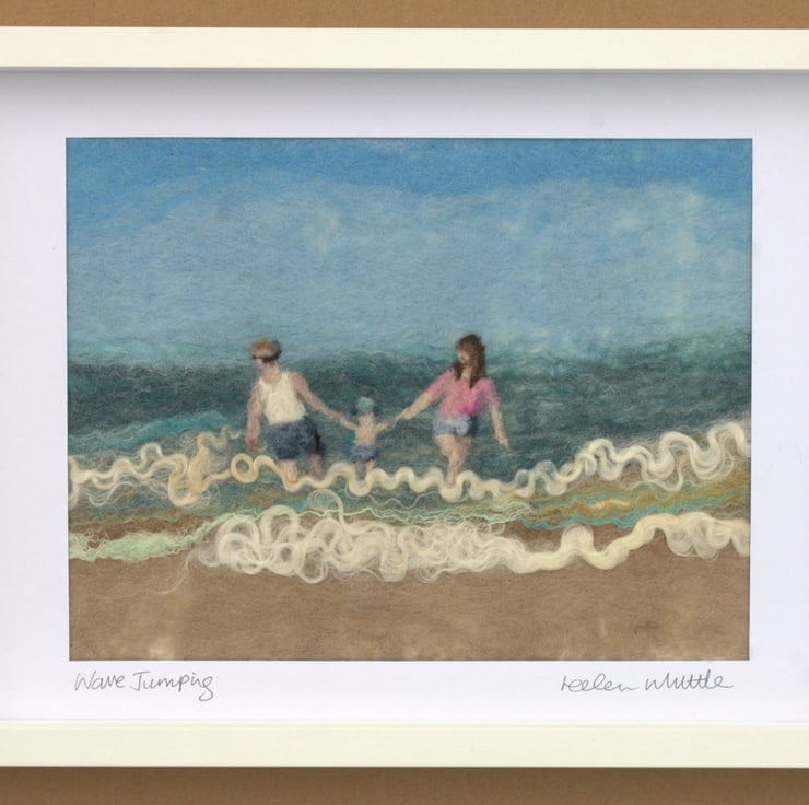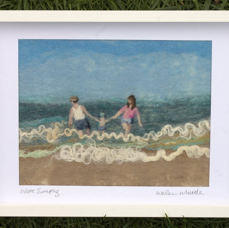 Original wet-felted art with needle-felted embellishment. This piece shows a couple dangling their young child above the summer waves and is designed and signed by the artist.