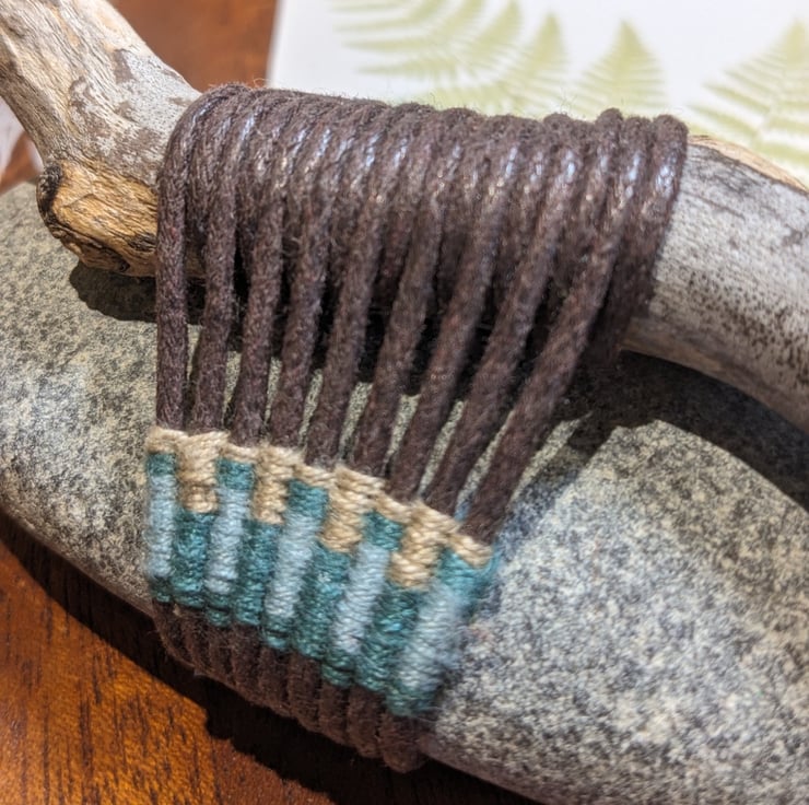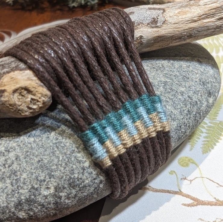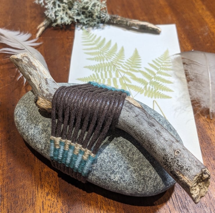 A small, tactile mindfulness object made from a woodland stick and a naturally smoothed stone, bound together with cord. Blue, teal and buff threads are woven into the binding reflecting subtle tones in the stone. The threads come from Masson Mills in the Derwent Valley World Heritage Site, adding a textile heritage connection to this natural talisman.