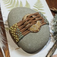 The pebble and wood are used as found, nothing has been carved or altered. It is made to be held as much as displayed, to bring a moment of calm and focus. Keep in on your desk or nature shelf ready to pick up absentmindedly when you need something tactile to ground you.