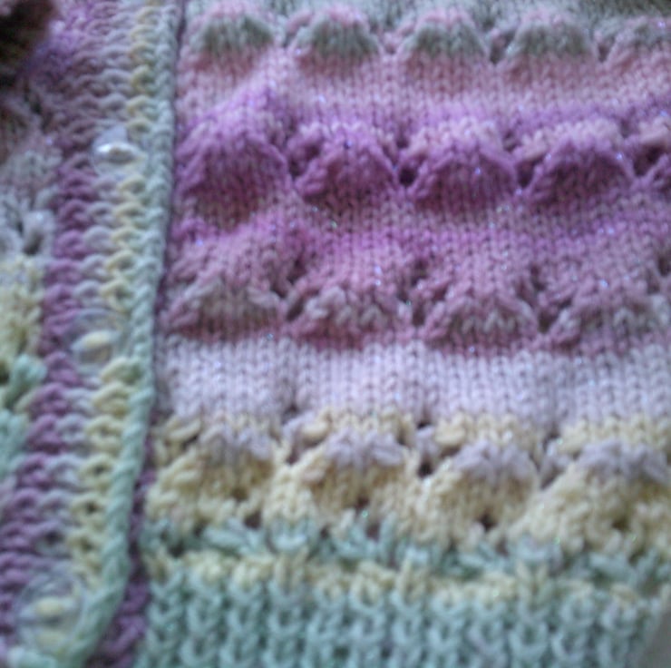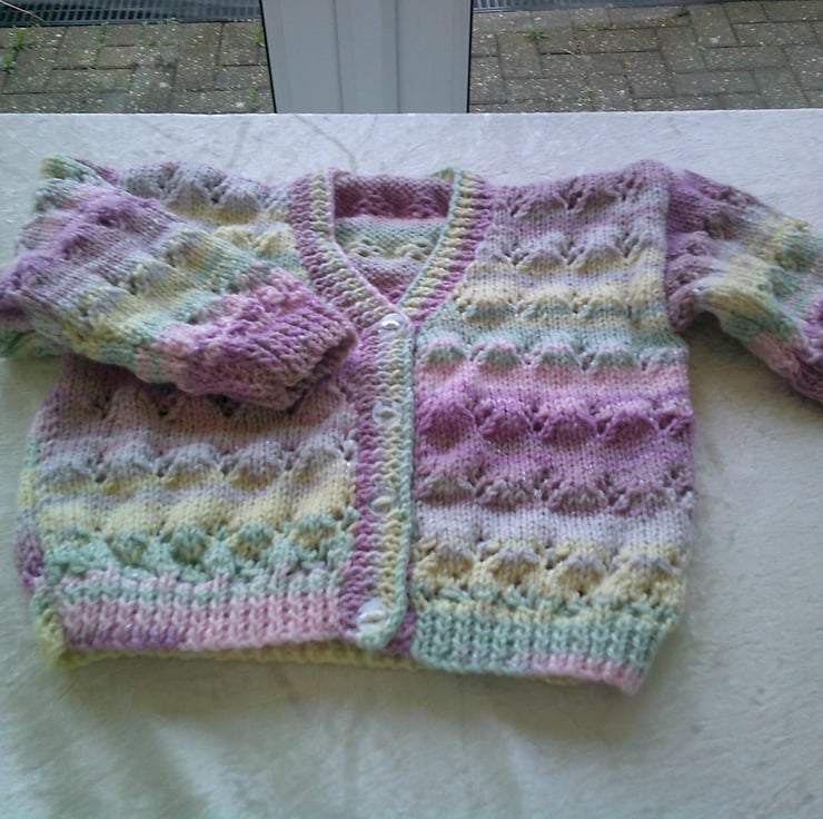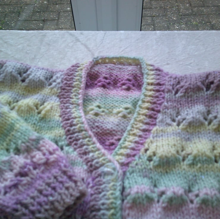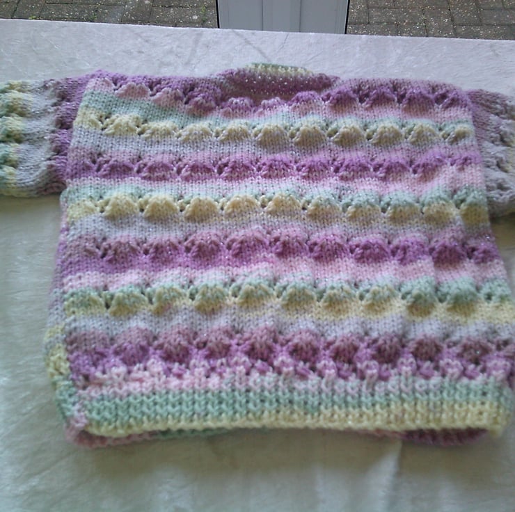 If is made using acrylic yarn in shades of lemon, pink, green and mauve and has a sparkly thread running through it with clear fish eye buttons.