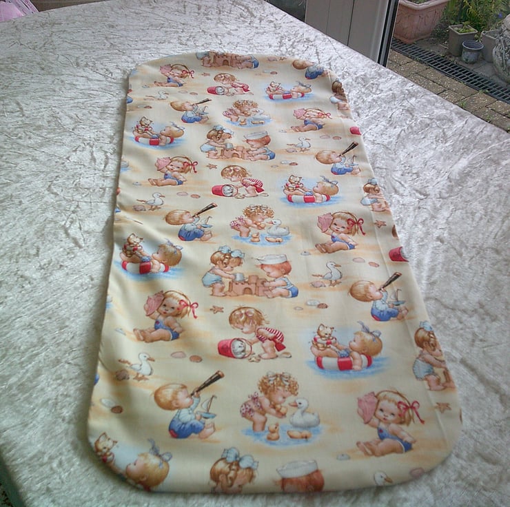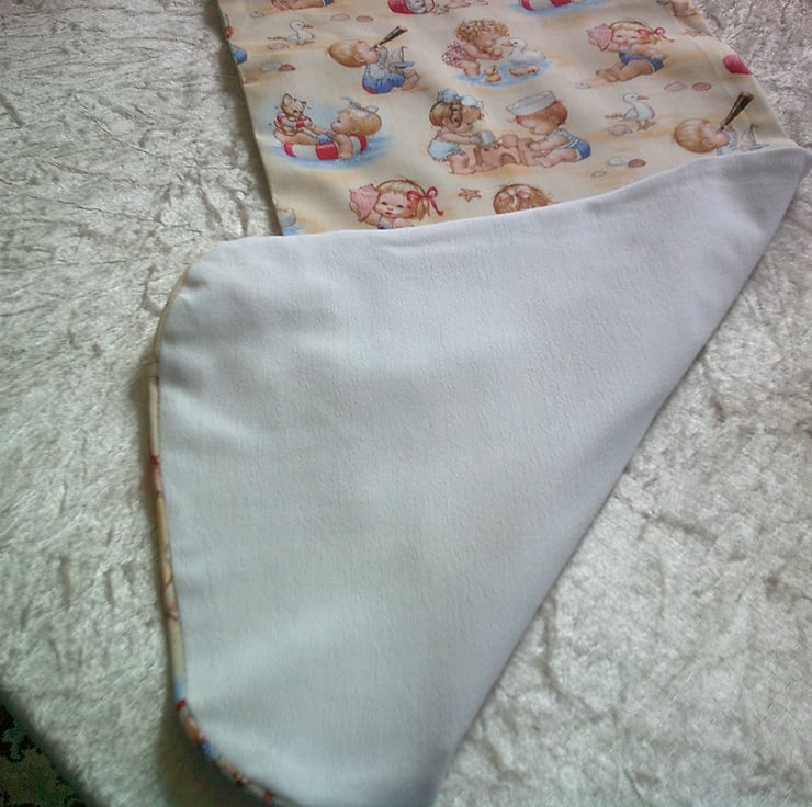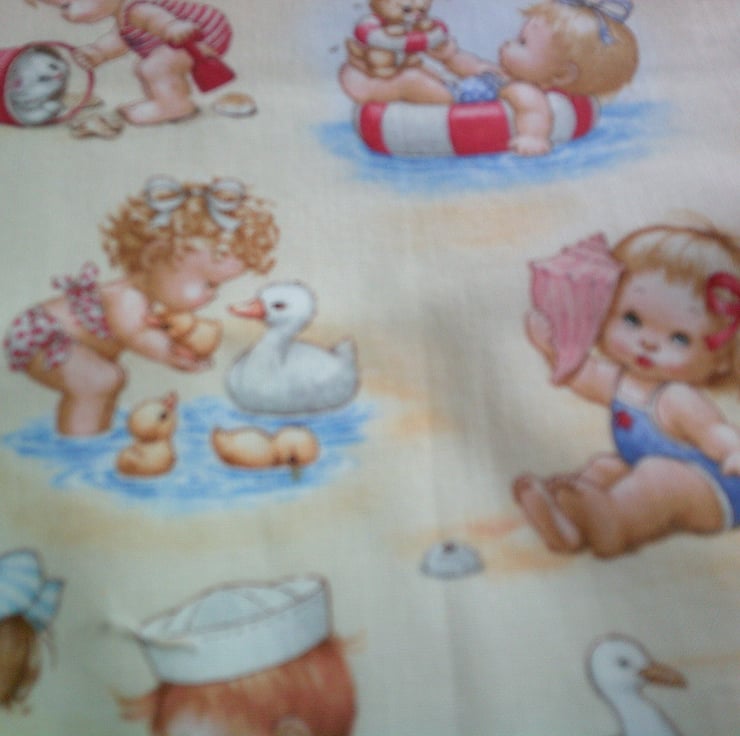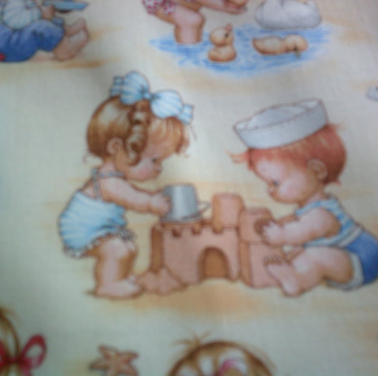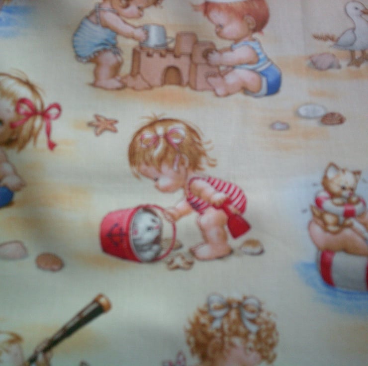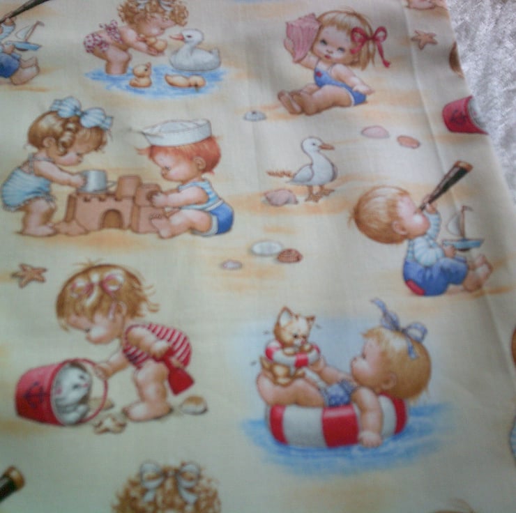 The fabric used is 100% cotton with a design of little children playing on the beach, building sand castles, listening to sea shells and playing in the water on a dark cream background on one side and has a reverse side of white stretch terry towelling