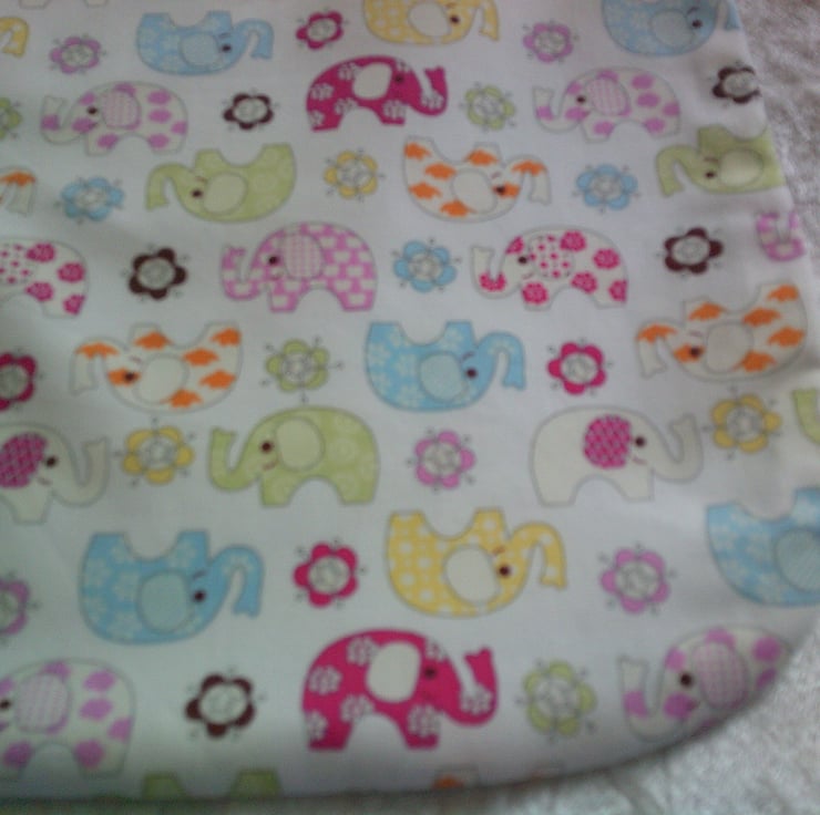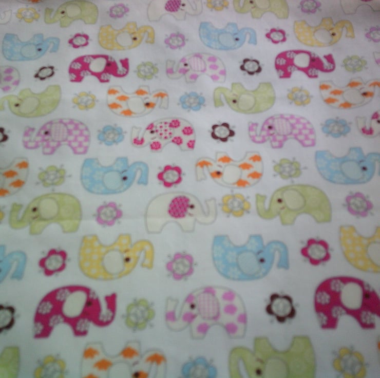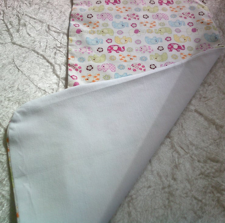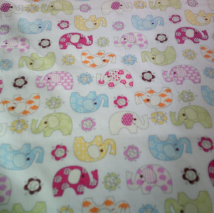 The fabric used is 100% cotton with a design of pastel coloured elephants on a white background on one side and has a reverse side of white stretch terry towelling