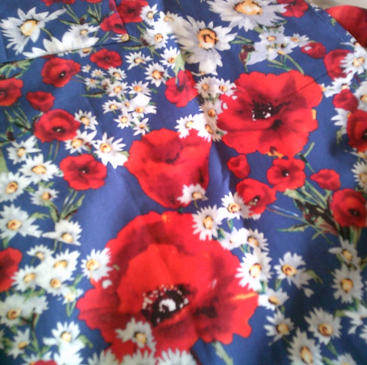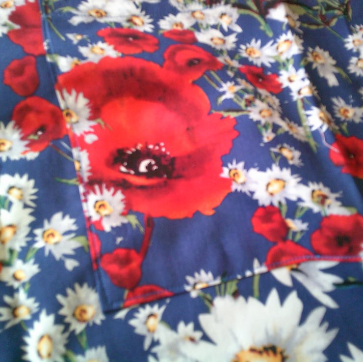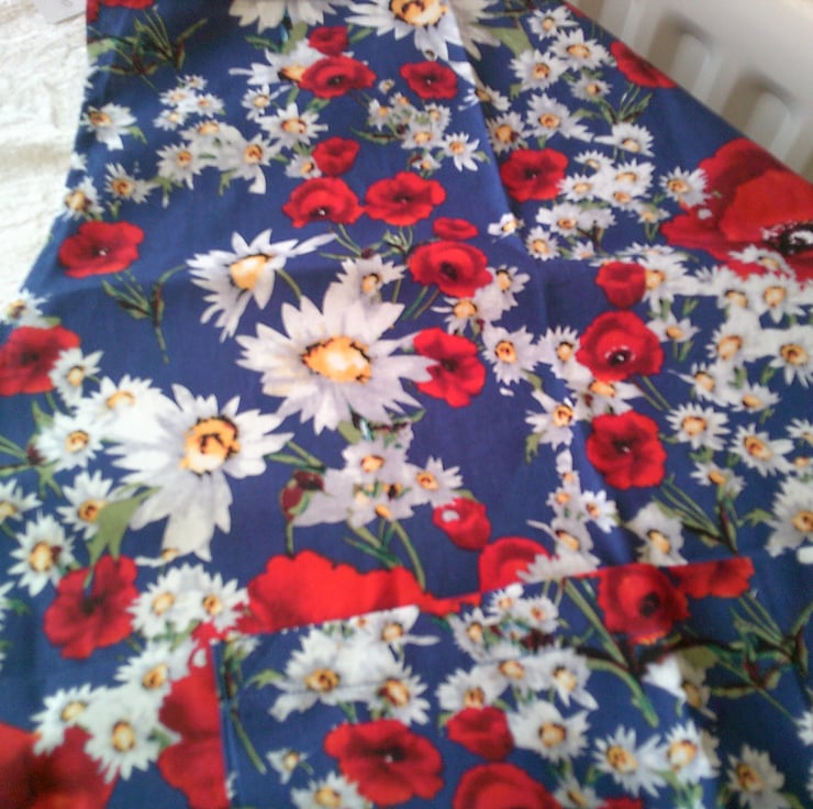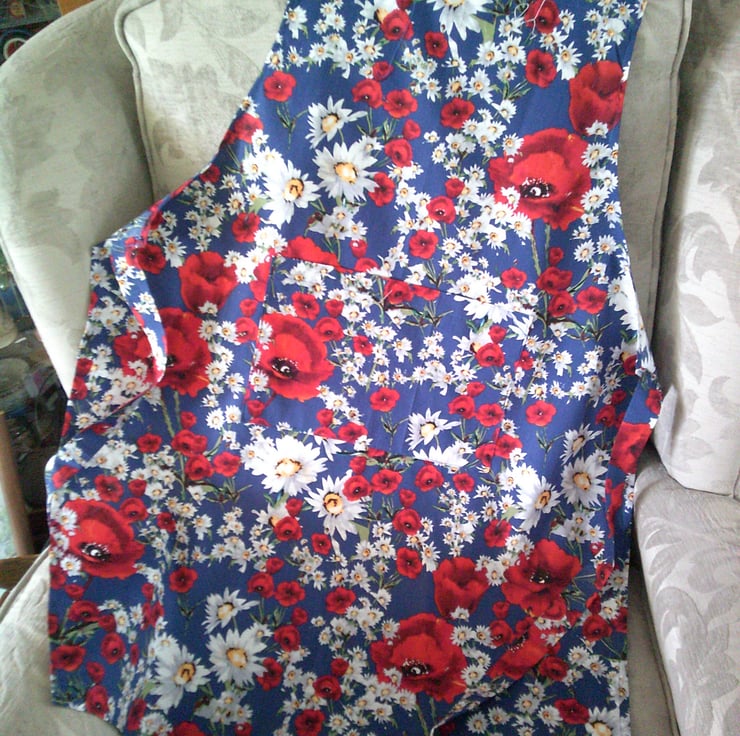 The design of the fabric used for this apron is of poppies and daisies on a blue background and would brighten anyone's day.