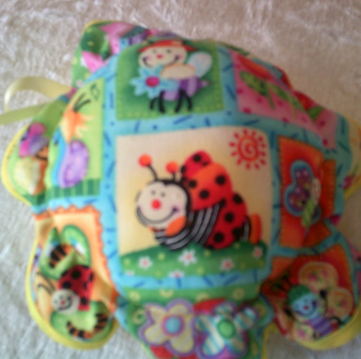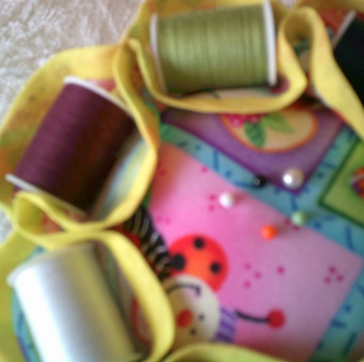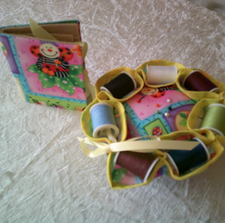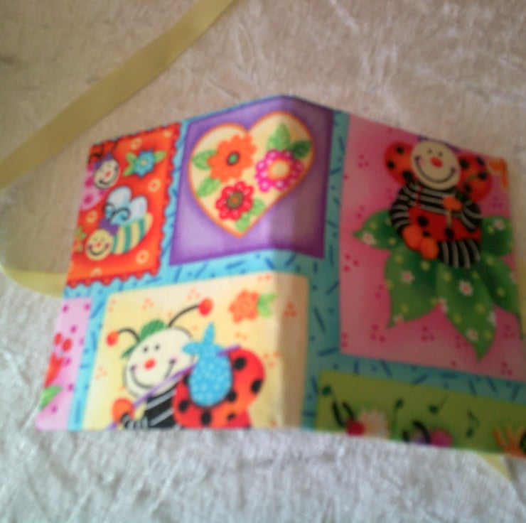The design on this set is comical insects including ladybirds on a pink and blue background. The pin cushion is edged with a contrasting yellow bias binding, the needle case has yellow ribbon for tying up to keep it closed.
