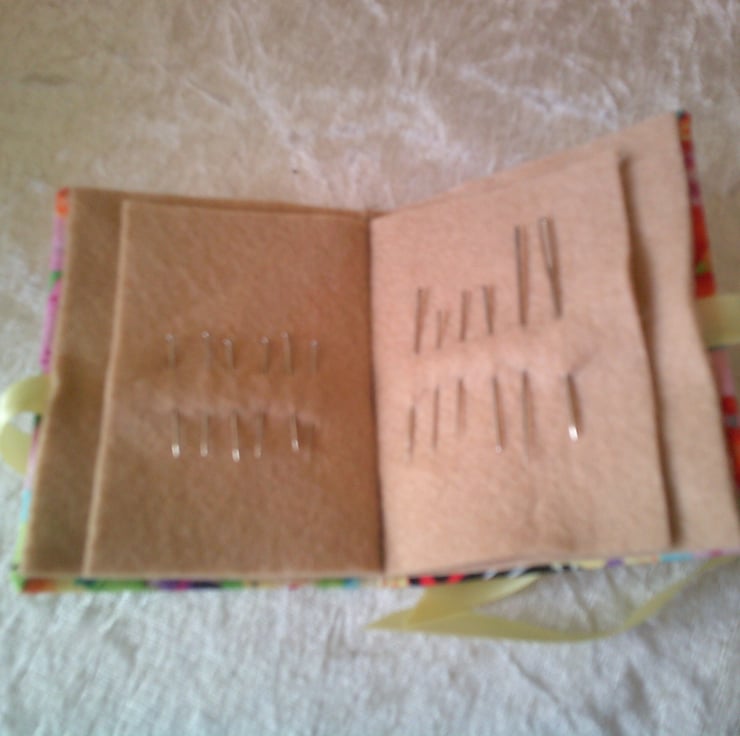 The needle case comes with a small selection of sewing needles and dressmakers pins with space for adding more.