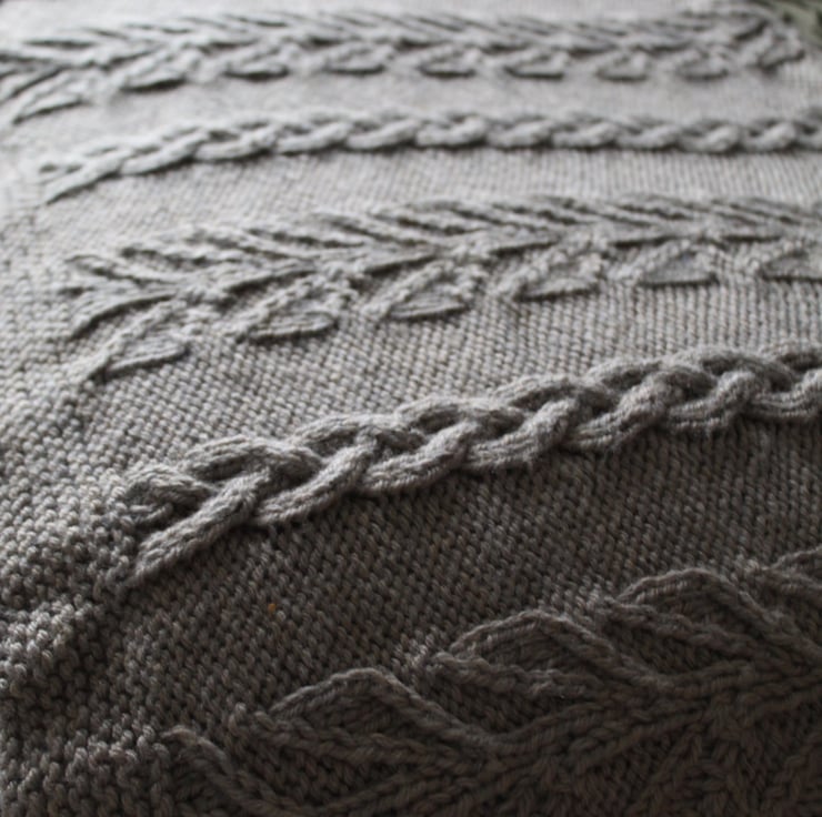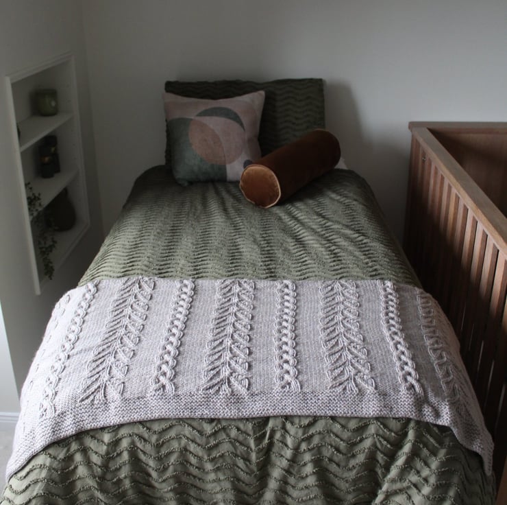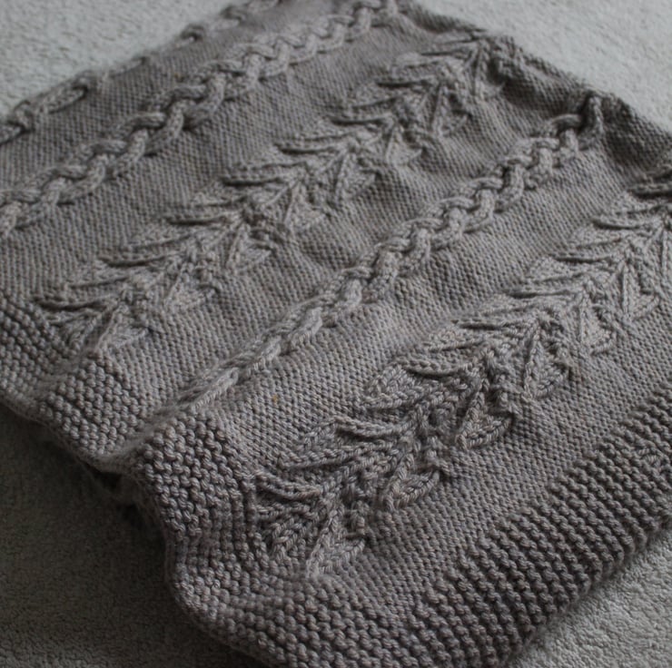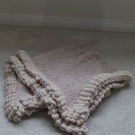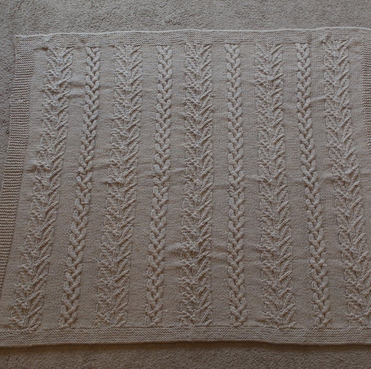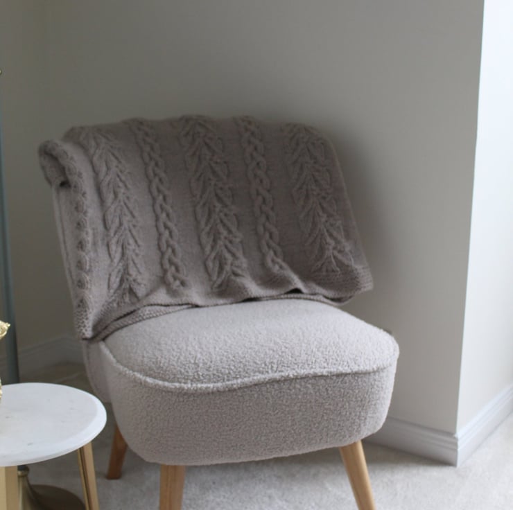 Beige handknit, cable aran throw/blanket. Perfect for sofa, chair, cot or bed. Machine wash at 30 degrees. 125x100cms