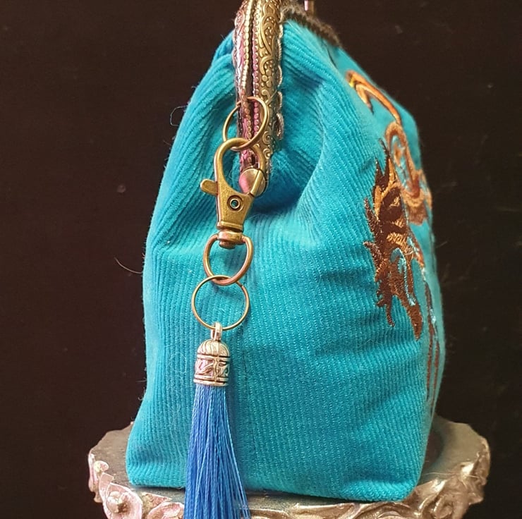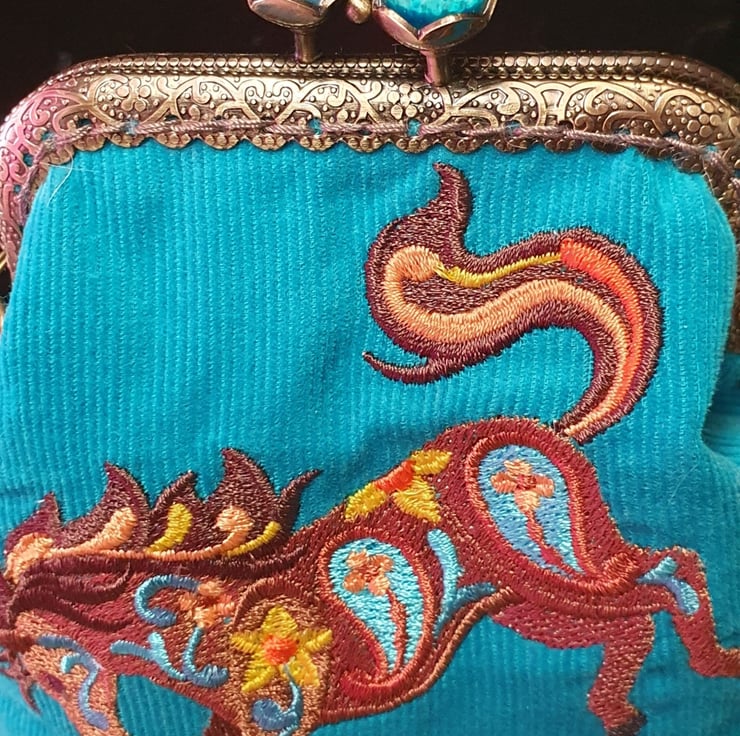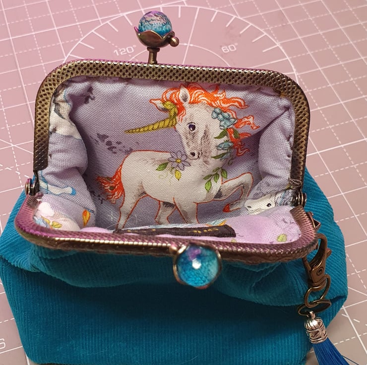 Metal frame is antique bronze colour with unusual crystal, kiss lock clasp.