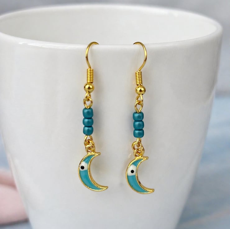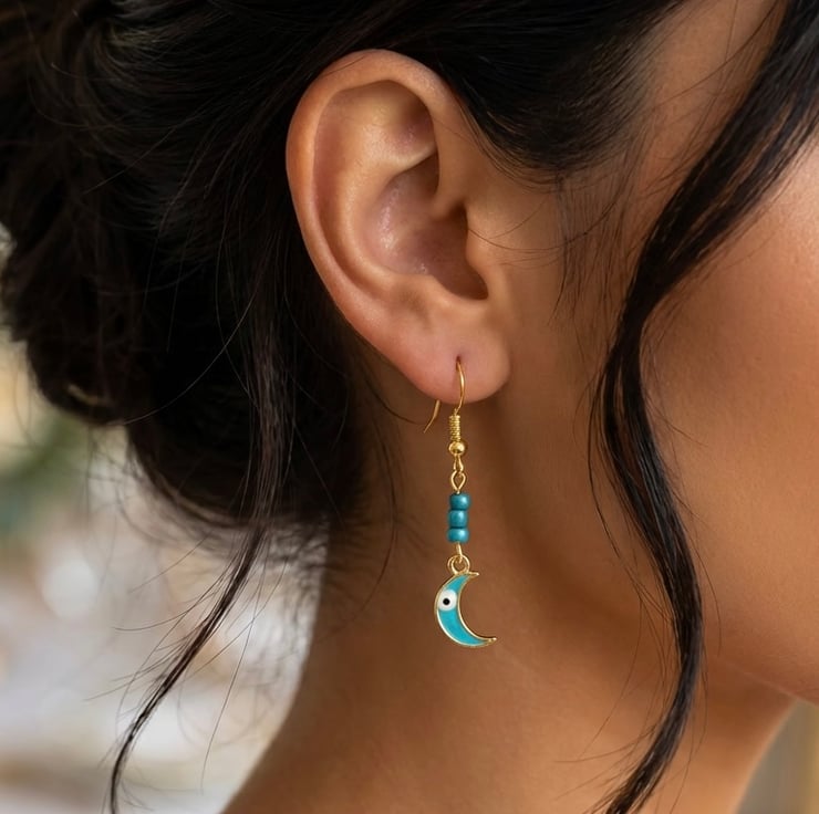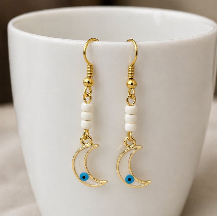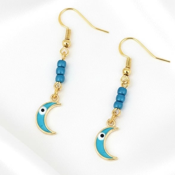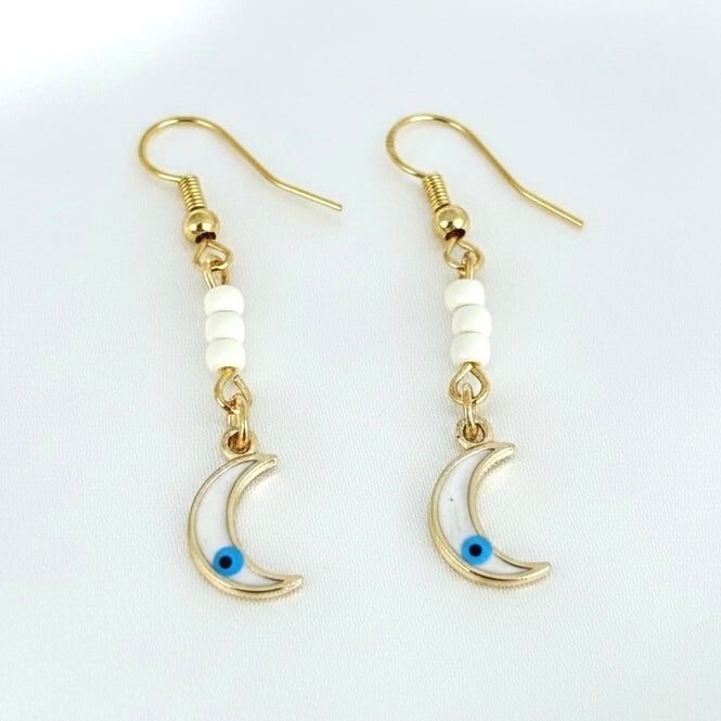 Exquisite Charms: Hand-crafted with 14k gold and vibrant enamel, these crescent moons are designed to catch the light and the eye, each have a tiny evil eye detail.