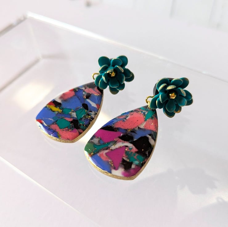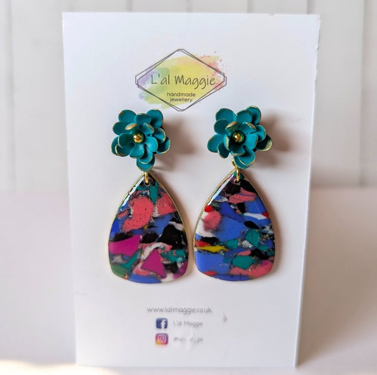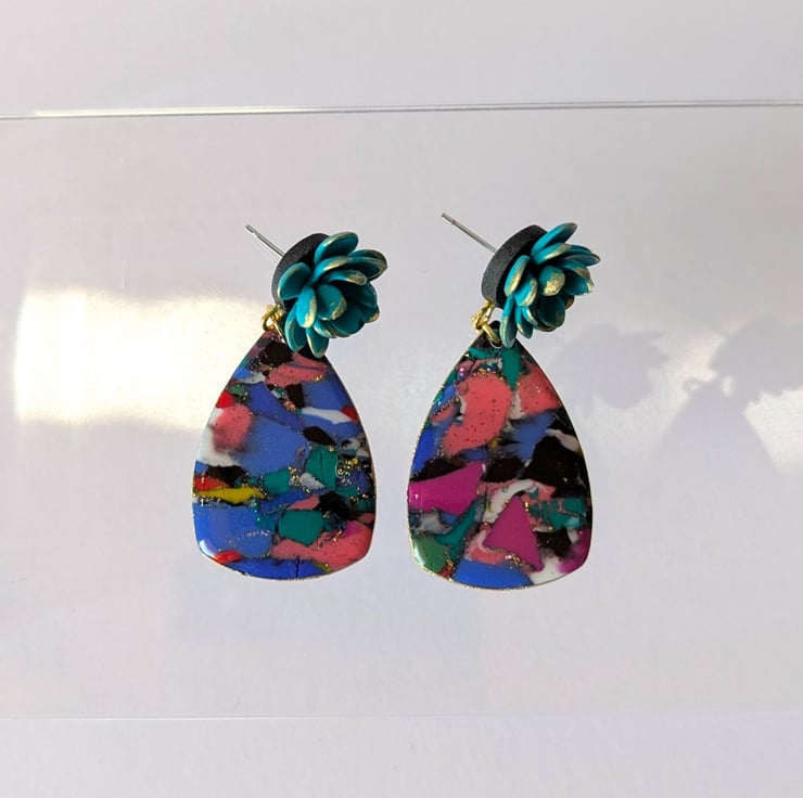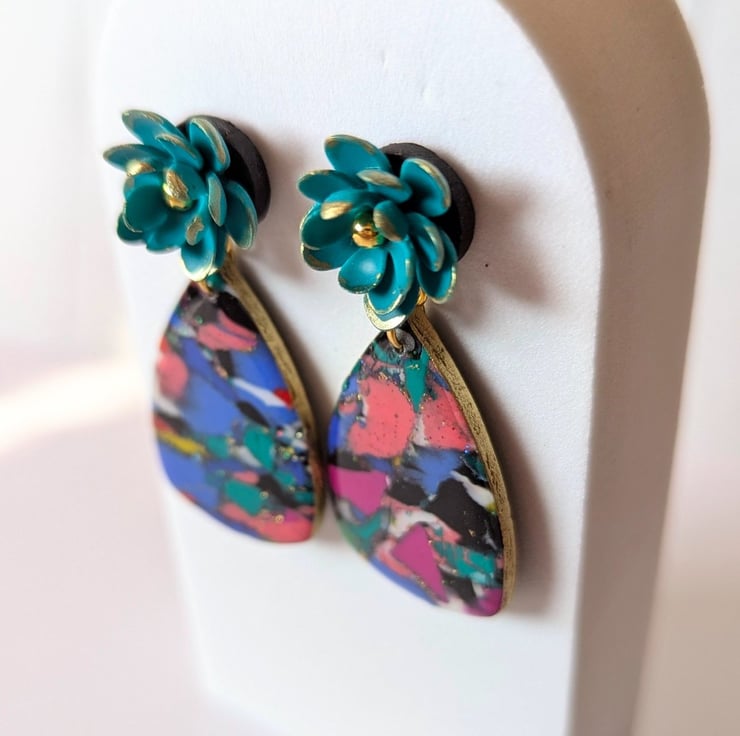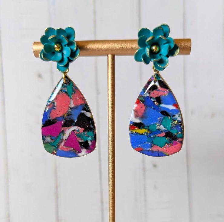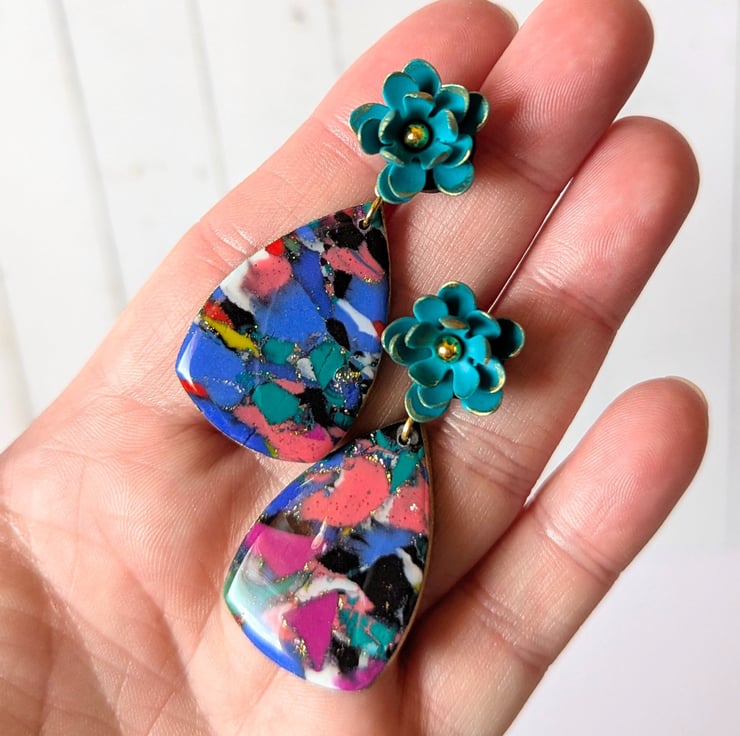 These earrings are made from scrap clay, reconditioned and repurposed into a new marbled design. There are additions of gold leaf, holographic glitter, gold gilding on the edges and a UV resin finish to give it shine and sparkle. The are topped with handmade teal flower stud tops, with more gold gilding and mounted on a stainless steel post.