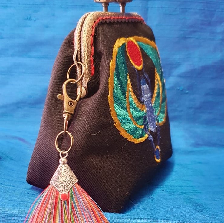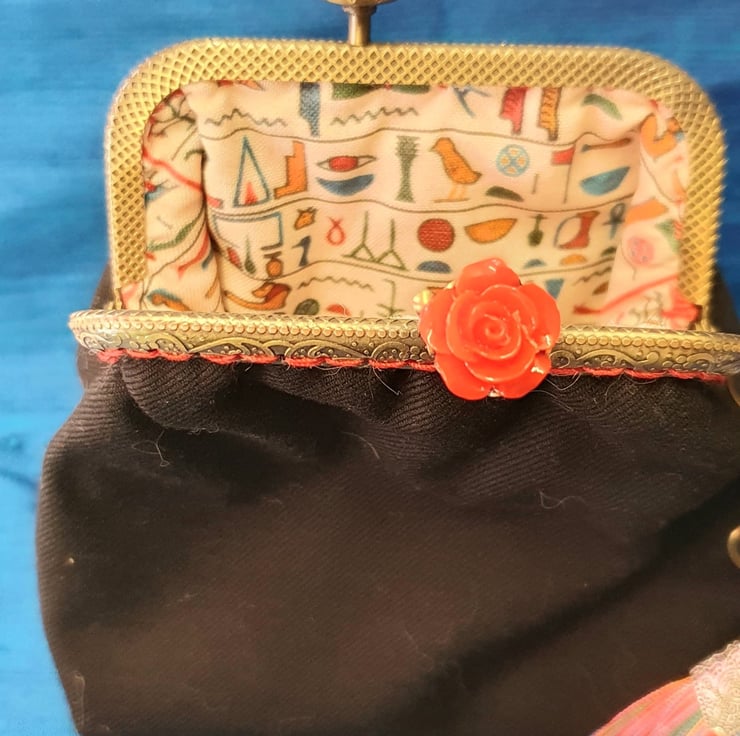 Metal frame is antique bronze colour with an unusual rose kiss lock clasp.