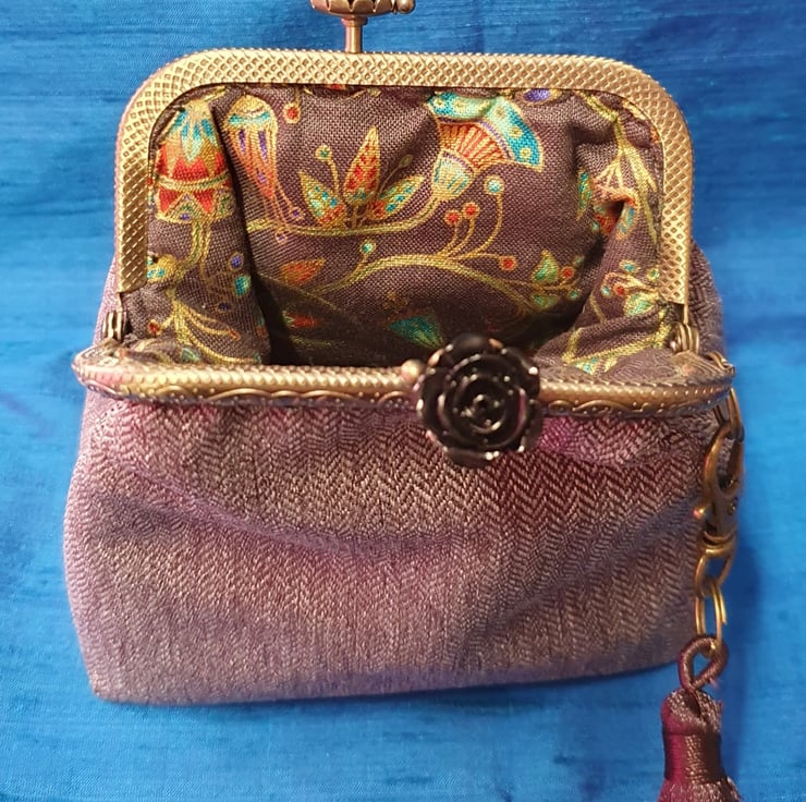 Metal frame is antique bronze colour with an unusual rose kiss lock clasp.