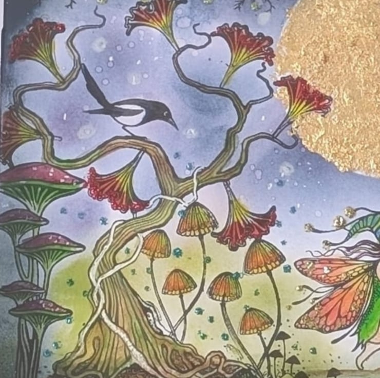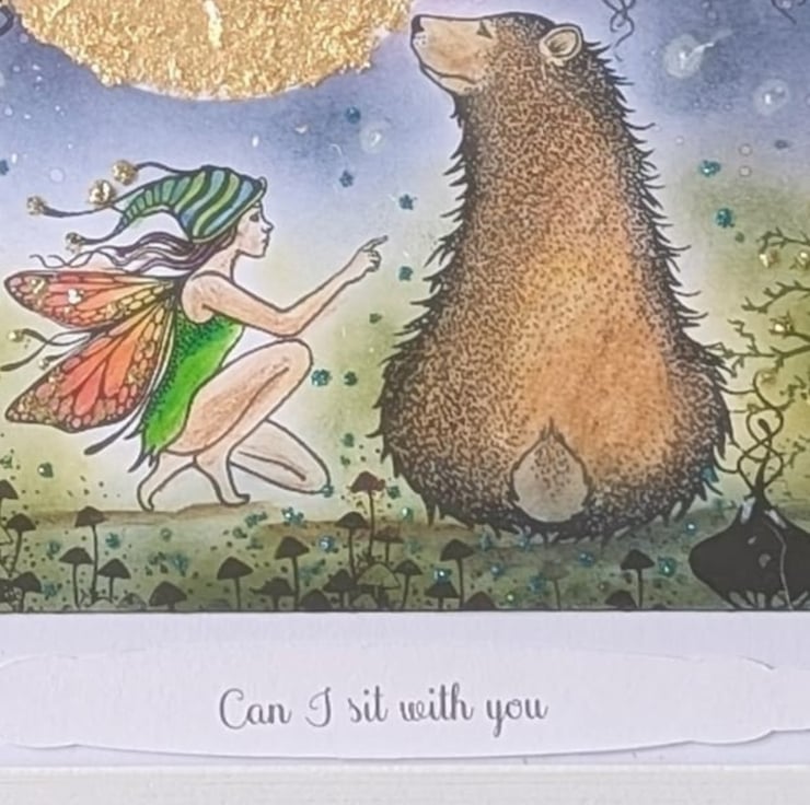 This enchanting scene has been stamped in gorgeous Lavinia stamps watercolours, inks and pan pastels have been used to create "Can I sit with You". The Moon has been gilded in gold Flakes.