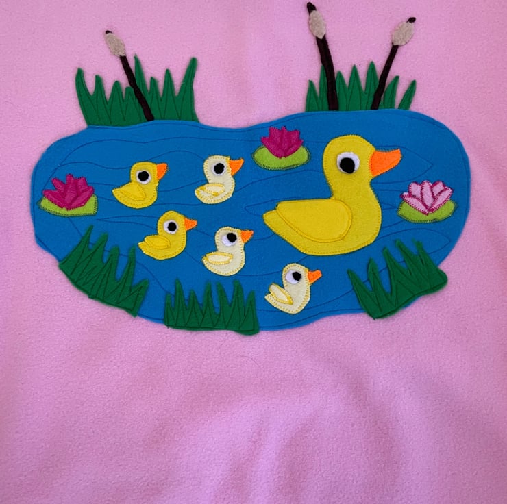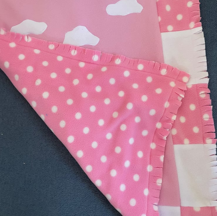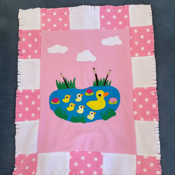 A Paul fleece appliqued Quilt that is ideal for a baby shower present or a gift for a younger child. The Quilt can be used as a play mat or a pushchair cover. The motifs are. appliquéd and it is reversible as the backing is also polar fleece making this super warm and cozy.The quilt measures 25" x 30"(64cmsx76cms)