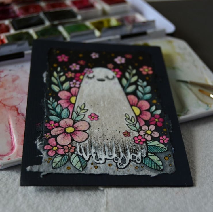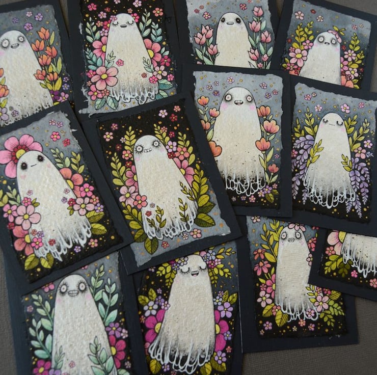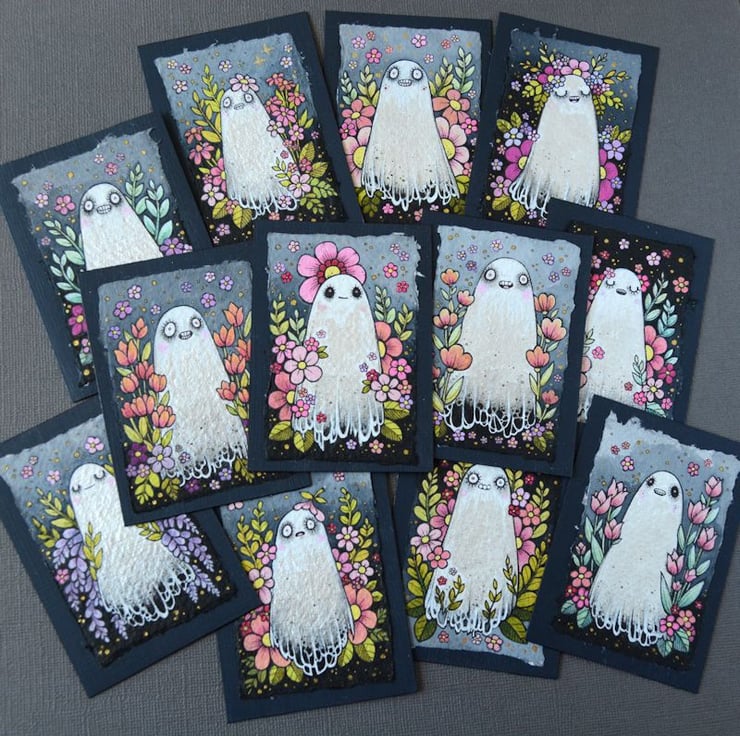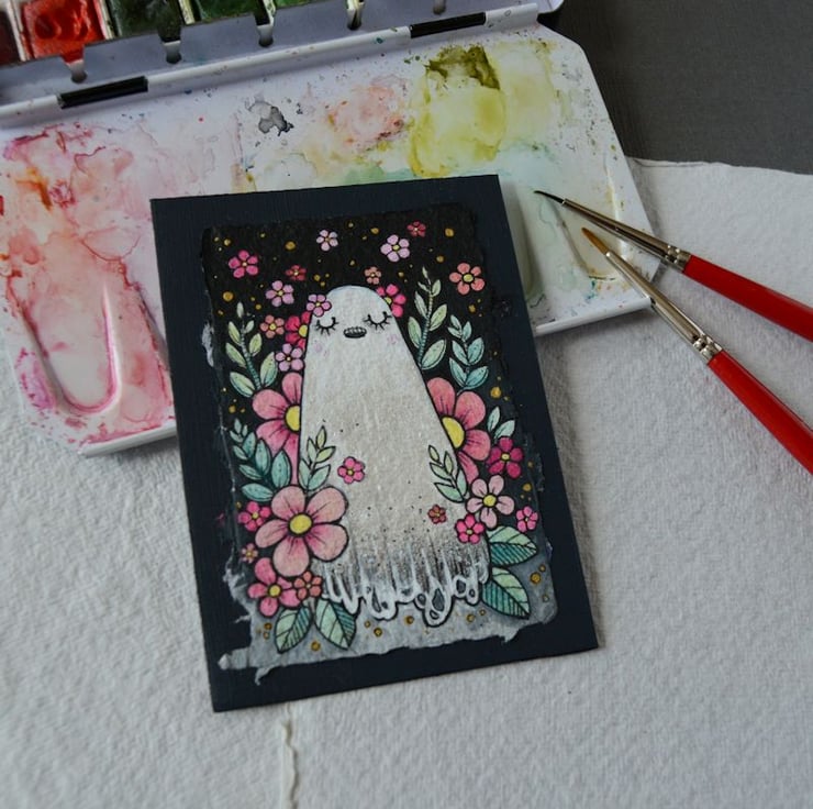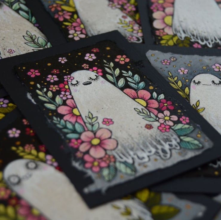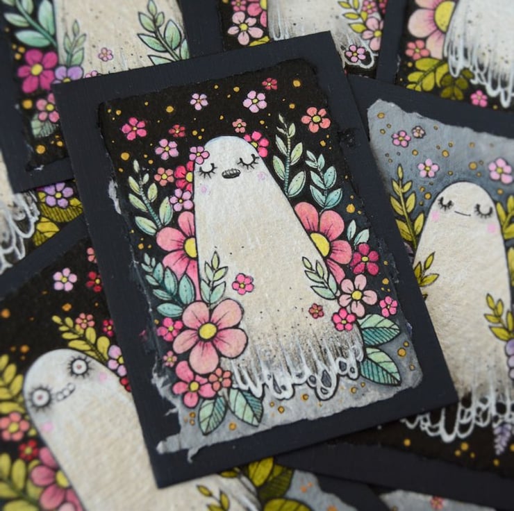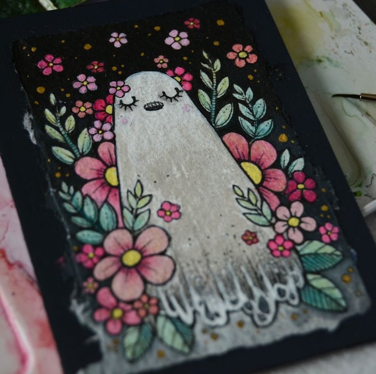 a miniature illustration of a little ghost enjoying the seasonal vibes, surrounded by spring blooms and blossom.